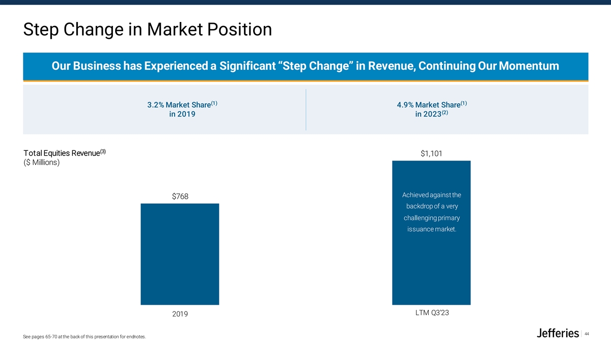 Step Change in Market Position Our Business has Experienced a Significant “Step Change” in Revenue, Continuing Our Momentum (1) (1) 3.2% Market Share 4.9% Market Share (2) in 2019 in 2023 (3) Total Equities Revenue $1,101 ($ Millions) Achieved against the Achieved against the $768 backdrop of a very backdrop of a very LTM results on par with nd our 2 best annual result challenging primary challenging primary ever issuance market. issuance market. LTM Q3’23 2019 2023 LTM 44 See pages 65-70 at the back of this presentation for endnotes.