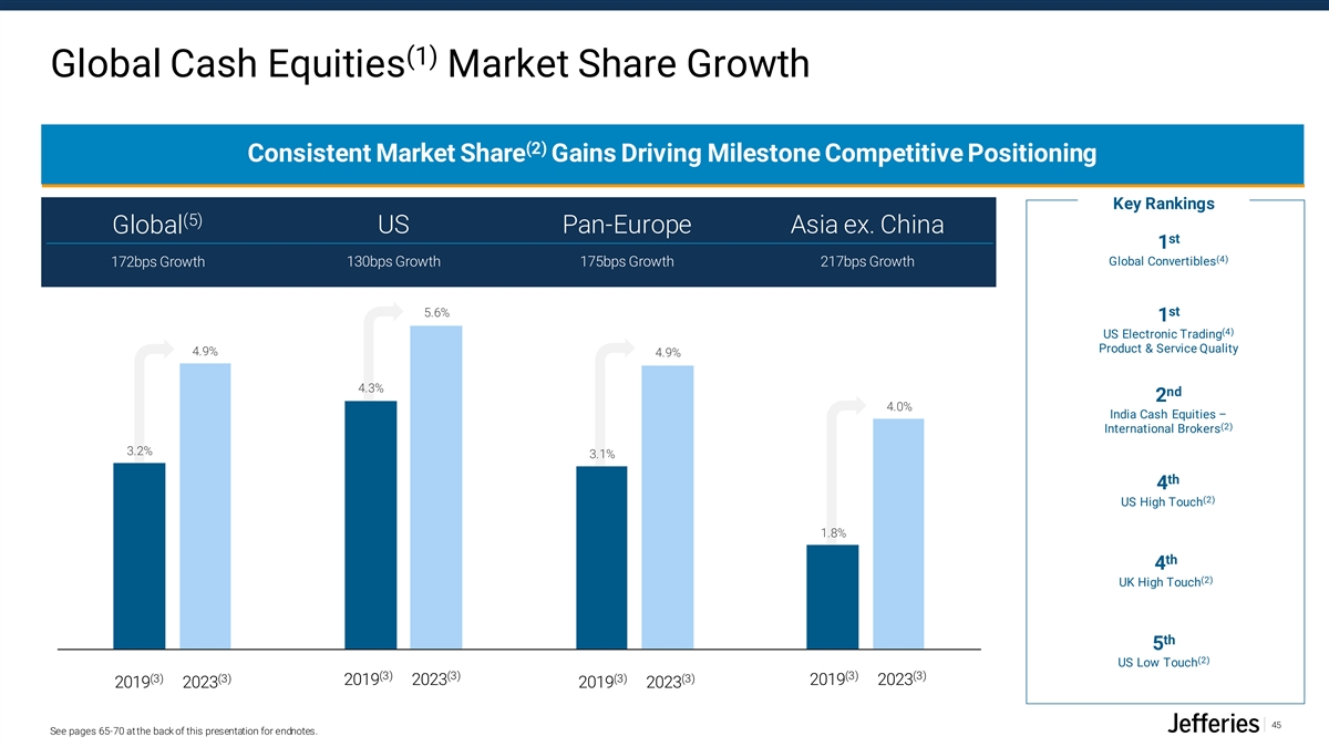(1) Global Cash Equities Market Share Growth (2) Consistent Market Share Gains Driving Milestone Competitive Positioning Key Rankings (5) Global US Pan-Europe Asia ex. China st 1 (4) Global Convertibles 172bps Growth 130bps Growth 175bps Growth 217bps Growth 5.6% st 1 (4) US Electronic Trading Product & Service Quality 4.9% 4.9% 4.3% nd 2 4.0% India Cash Equities – (2) International Brokers 3.2% 3.1% th 4 (2) US High Touch 1.8% th 4 (2) UK High Touch th 5 (2) US Low Touch (3) (3) (3) (3) (3) (3) (3) (3) 2019 2023 2019 2023 2019 2023 2019 2023 45 See pages 65-70 at the back of this presentation for endnotes.