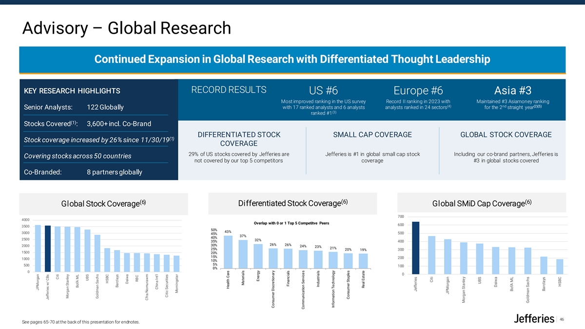 Advisory – Global Research Continued Expansion in Global Research with Differentiated Thought Leadership KEY RESEARCH HIGHLIGHTS RECORD RESULTS US #6 Europe #6 Asia #3 Most improved ranking in the US survey Record II ranking in 2023 with Maintained #3 Asiamoney ranking (4) nd (2)(5) with 17 ranked analysts and 6 analysts analysts ranked in 24 sectors for the 2 straight year Senior Analysts: 122 Globally (3) ranked #1 (1) Stocks Covered : 3,600+ incl. Co-Brand DIFFERENTIATED STOCK SMALL CAP COVERAGE GLOBAL STOCK COVERAGE (1) Stock coverage increased by 26% since 11/30/19 COVERAGE 29% of US stocks covered by Jefferies are Jefferies is #1 in global small cap stock Including our co-brand partners, Jefferies is Covering stocks across 50 countries not covered by our top 5 competitors coverage #3 in global stocks covered Co-Branded: 8 partners globally (6) (6) (6) Differentiated Stock Coverage Global Stock Coverage Global SMiD Cap Coverage 700 4000 Overlap with 0 or 1 Top 5 Competitve Peers 600 3500 50% 43% 3000 500 45% 37% 40% 2500 32% 35% 400 26% 26% 30% 2000 24% 23% 21% 25% 20% 19% 300 1500 20% 15% 200 1000 10% 5% 500 100 0% 0 0 46 See pages 65-70 at the back of this presentation for endnotes. JPMorgan Jefferies w/ CBs Citi Morgan Stanley BofA ML UBS Goldman Sachs HSBC Barclays Daiwa RBC Cfra/Nomurawm China Int'l Citic Securities Morningstar Health Care Materials Energy Consumer Discretionary Financials Communication Services Industrials Information Technology Consumer Staples Real Estate Jefferies Citi JPMorgan Morgan Stanley UBS Daiwa BofA ML Goldman Sachs Barclays HSBC