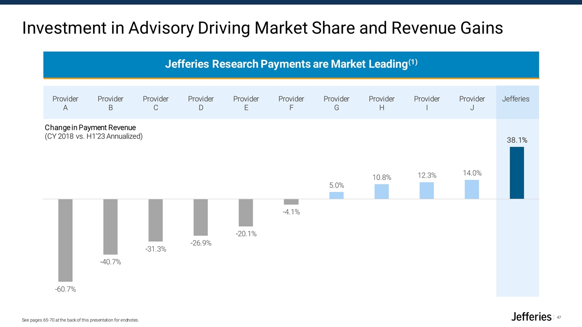 Investment in Advisory Driving Market Share and Revenue Gains (1) Jefferies Research Payments are Market Leading Provider Provider Provider Provider Provider Provider Provider Provider Provider Provider Jefferies A B C D E F G H I J Change in Payment Revenue (CY 2018 vs. H1’23 Annualized) 38.1% 14.0% 12.3% 10.8% 5.0% -4.1% -20.1% -26.9% -31.3% -40.7% -60.7% 47 See pages 65-70 at the back of this presentation for endnotes.