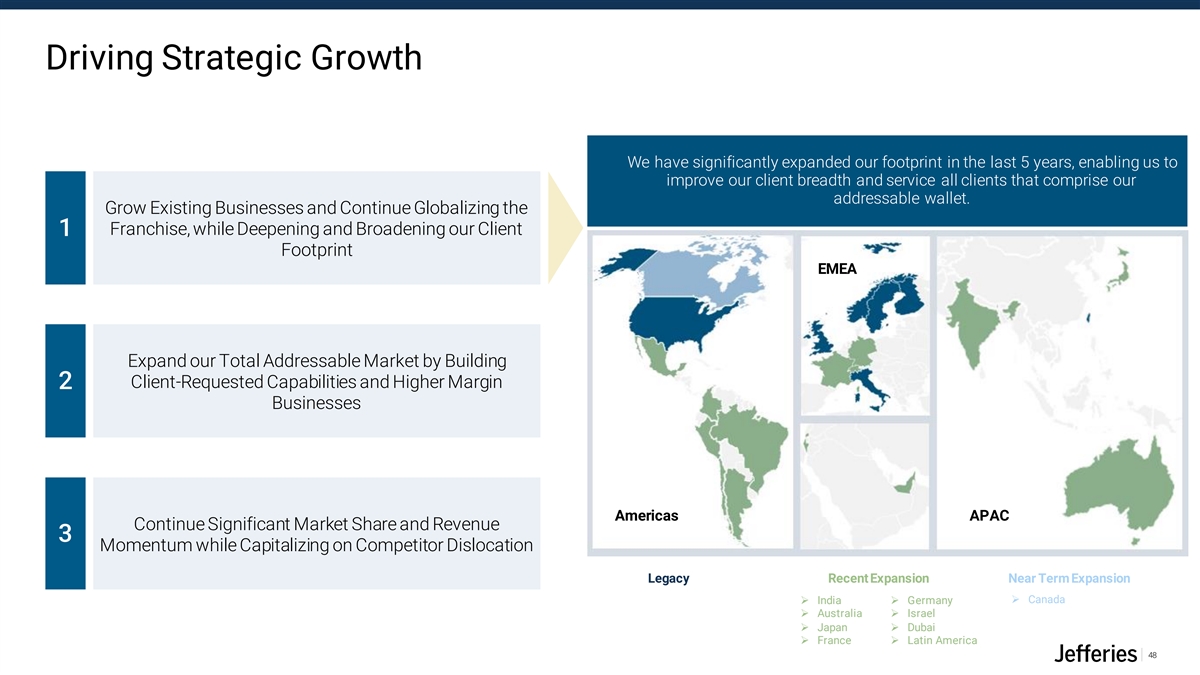Driving Strategic Growth We have significantly expanded our footprint in the last 5 years, enabling us to improve our client breadth and service all clients that comprise our addressable wallet. Grow Existing Businesses and Continue Globalizing the Franchise, while Deepening and Broadening our Client 1 Footprint EMEA Expand our Total Addressable Market by Building 2 Client-Requested Capabilities and Higher Margin Businesses Americas APAC Continue Significant Market Share and Revenue 3 Momentum while Capitalizing on Competitor Dislocation Legacy Recent Expansion Near Term Expansion ➢ India➢ Germany➢ Canada ➢ Australia➢ Israel ➢ Japan➢ Dubai ➢ France➢ Latin America 48
