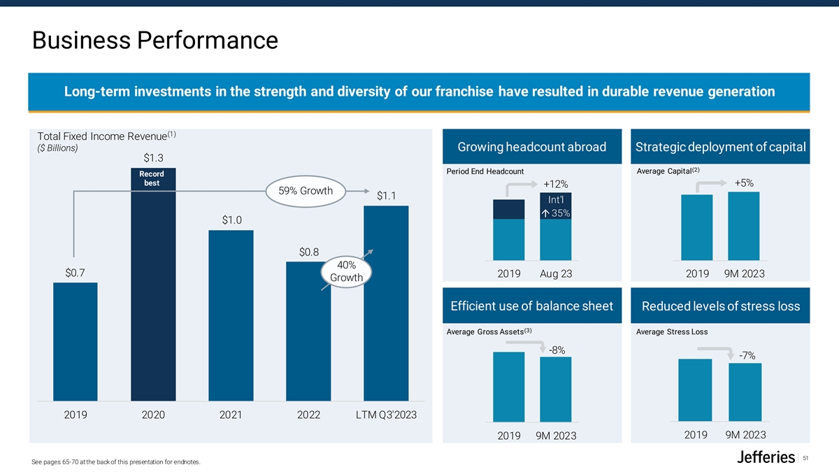 Business Performance Long-term investments in the strength and diversity of our franchise have resulted in durable revenue generation (1) Total Fixed Income Revenue ($ Billions) Growing headcount abroad Strategic deployment of capital $1.3 (2) Period End Headcount Average Capital Record best +5% +12% 59% Growth $1.1 Int’l á 35% $1.0 $0.8 40% $0.7 2019 Aug 23 2019 9M 2023 Growth Efficient use of balance sheet Reduced levels of stress loss (3) Average Gross Assets Average Stress Loss -8% -7% 2019 2020 2021 2022 LTM Q3'2023 2019 9M 2023 2019 9M 2023 51 See pages 65-70 at the back of this presentation for endnotes.