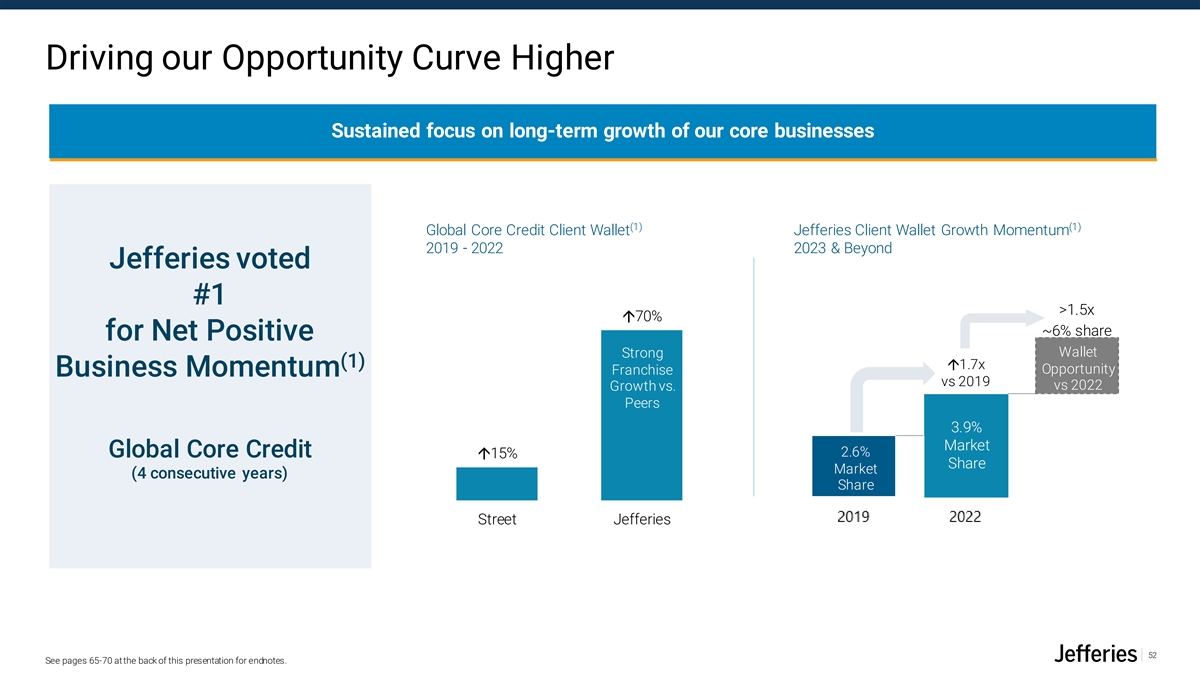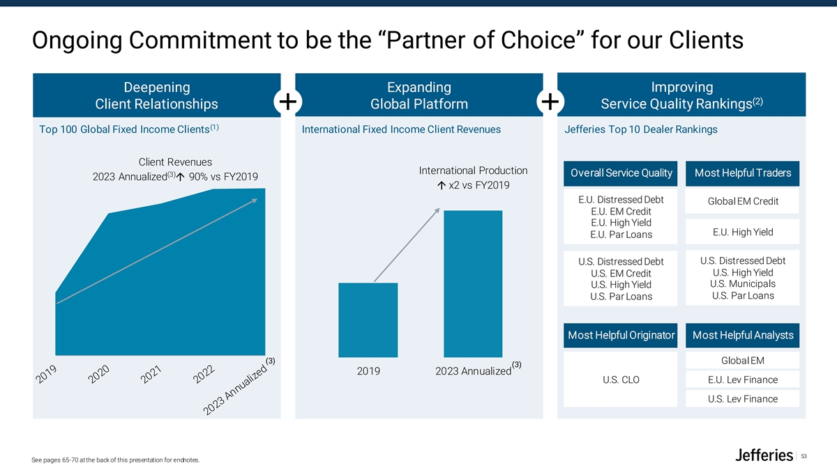 Driving our Opportunity Curve Higher Sustained focus on long-term growth of our core businesses (1) (1) Global Core Credit Client Wallet Jefferies Client Wallet Growth Momentum 2019 - 2022 2023 & Beyond Jefferies voted #1 >1.5x á70% ~6% share for Net Positive Wallet Strong (1) á1.7x Opportunity Franchise Business Momentum vs 2019 vs 2022 Growth vs. Peers 3.9% Market 2.6% Global Core Credit á15% Share Market (4 consecutive years) Share Street Jefferies 52 See pages 65-70 at the back of this presentation for endnotes.