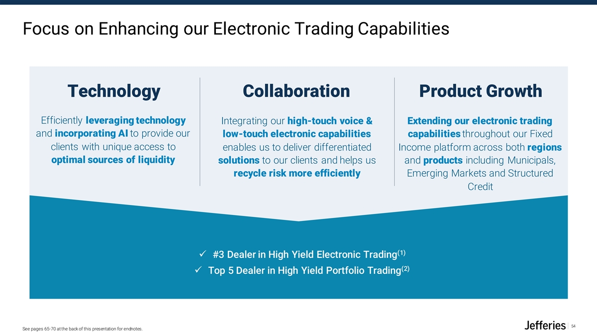 Ongoing Commitment to be the “Partner of Choice” for our Clients Deepening Expanding Improving (2) Client Relationships Global Platform Service Quality Rankings (1) Top 100 Global Fixed Income Clients International Fixed Income Client Revenues Jefferies Top 10 Dealer Rankings Client Revenues International Production (3) Overall Service Quality Most Helpful Traders 2023 Annualizedá 90% vs FY2019 á x2 vs FY2019 E.U. Distressed Debt Global EM Credit E.U. EM Credit E.U. High Yield E.U. High Yield E.U. Par Loans U.S. Distressed Debt U.S. Distressed Debt U.S. High Yield U.S. EM Credit U.S. Municipals U.S. High Yield U.S. Par Loans U.S. Par Loans Most Helpful Originator Most Helpful Analysts (3) Global EM (3) 2019 2023 Annualized U.S. CLO E.U. Lev Finance U.S. Lev Finance 53 See pages 65-70 at the back of this presentation for endnotes.