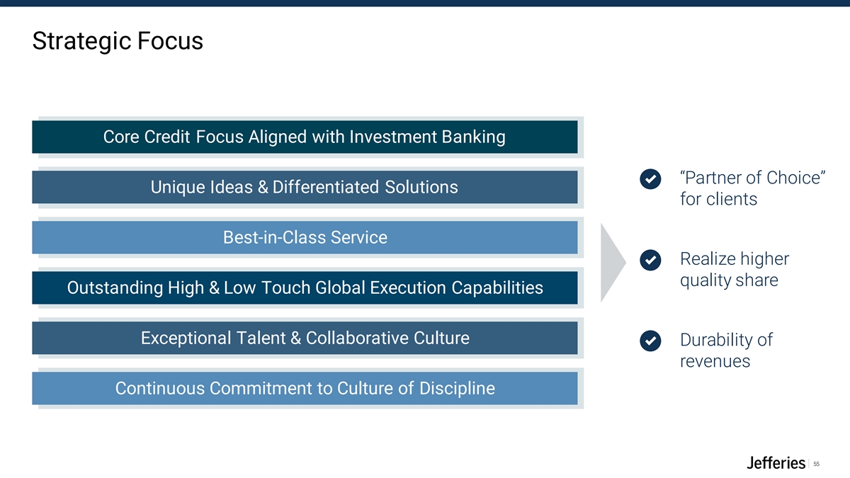 Strategic Focus Core Credit Focus Aligned with Investment Banking “Partner of Choice” Unique Ideas & Differentiated Solutions for clients Globalize Franchise and Best-in-Class Service Expand Client-Requested Capabilities Realize higher Globalize Franchise and quality share Outstanding High & Low Touch Global Execution Capabilities Expand Client-Requested Capabilities Globalize Franchise and Exceptional Talent & Collaborative Culture Durability of Expand Client-Requested Capabilities revenues Globalize Franchise and Continuous Commitment to Culture of Discipline Expand Client-Requested Capabilities 55