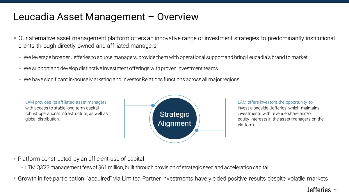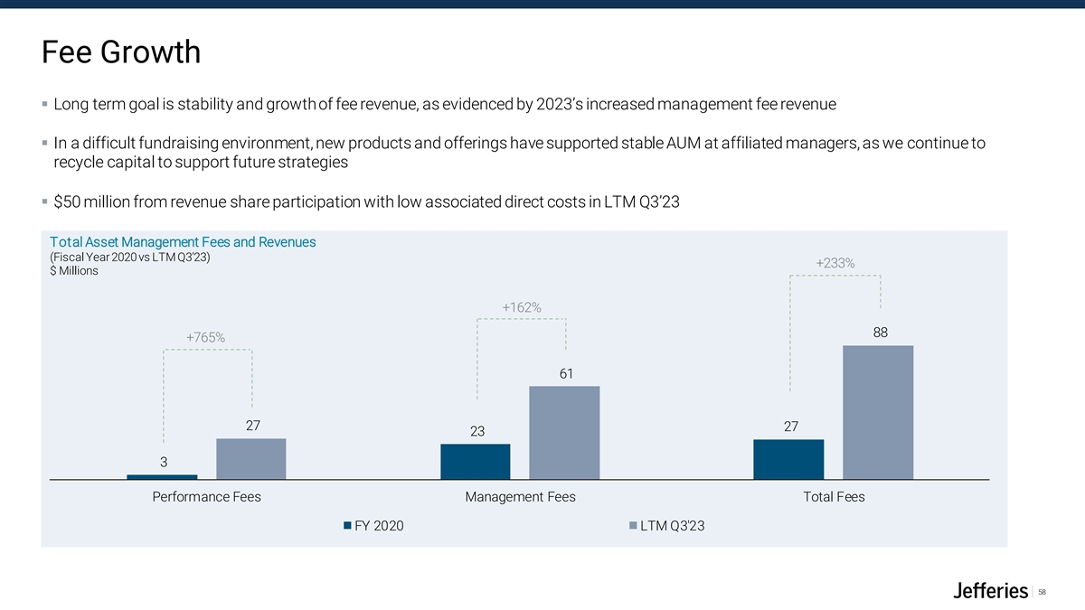 Leucadia Asset Management – Overview ▪ Our alternative asset management platform offers an innovative range of investment strategies to predominantly institutional clients through directly owned and affiliated managers ▪ We leverage broader Jefferies to source managers, provide them with operational support and bring Leucadia’s brand to market ▪ We support and develop distinctive investment offerings with proven investment teams ▪ We have significant in-house Marketing and Investor Relations functions across all major regions LAM provides its affiliated asset managers LAM offers investors the opportunity to with access to stable long-term capital, invest alongside Jefferies, which maintains robust operational infrastructure, as well as investments with revenue share and/or global distribution. equity interests in the asset managers on the platform. ▪ Platform constructed by an efficient use of capital ▪ LTM Q3’23 management fees of $61 million, built through provision of strategic seed and acceleration capital ▪ Growth in fee participation “acquired” via Limited Partner investments have yielded positive results despite volatile markets 57