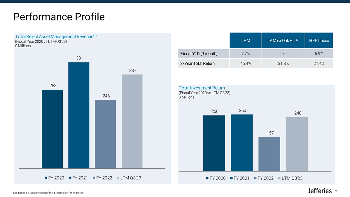 Performance Profile (1) Total Select Asset Management Revenue (2) LAM LAM ex Oak Hill HFRI Index (Fiscal Year 2020 vs LTM Q3’23) $ Millions Fiscal YTD (9 month) 7.7% n/a 5.9% 381 3-Year Total Return 45.4% 31.8% 21.4% 337 283 Total Investment Return (Fiscal Year 2020 vs LTM Q3’23) 246 $ Millions 260 256 248 157 FY 2020 FY 2021 FY 2022 LTM Q3'23 FY 2020 FY 2021 FY 2022 LTM Q3'23 59 See pages 65-70 at the back of this presentation for endnotes.