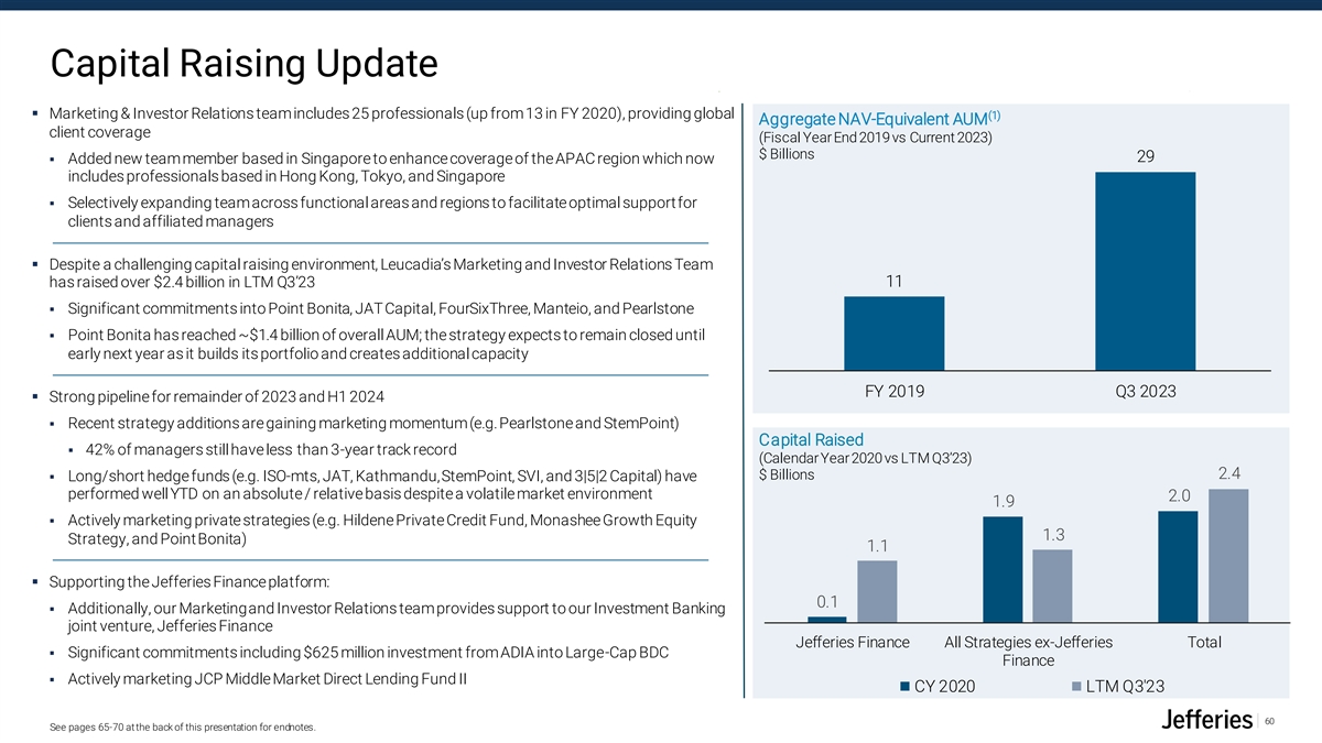 Capital Raising Update ▪ Marketing & Investor Relations team includes 25 professionals (up from 13 in FY 2020), providing global (1) Aggregate NAV-Equivalent AUM client coverage (Fiscal Year End 2019 vs Current 2023) $ Billions 29 ▪ Added new team member based in Singapore to enhance coverage of the APAC region which now includes professionals based in Hong Kong, Tokyo, and Singapore ▪ Selectively expanding team across functional areas and regions to facilitate optimal support for clients and affiliated managers ▪ Despite a challenging capital raising environment, Leucadia’s Marketing and Investor Relations Team has raised over $2.4 billion in LTM Q3’23 11 ▪ Significant commitments into Point Bonita, JAT Capital, FourSixThree, Manteio, and Pearlstone ▪ Point Bonita has reached ~$1.4 billion of overall AUM; the strategy expects to remain closed until early next year as it builds its portfolio and creates additional capacity FY 2019 Q3 2023 ▪ Strong pipeline for remainder of 2023 and H1 2024 ▪ Recent strategy additions are gaining marketing momentum (e.g. Pearlstone and StemPoint) Capital Raised ▪ 42% of managers still have less than 3-year track record (Calendar Year 2020 vs LTM Q3’23) 2.4 $ Billions ▪ Long/short hedge funds (e.g. ISO-mts, JAT, Kathmandu, StemPoint, SVI, and 3|5|2 Capital) have performed well YTD on an absolute / relative basis despite a volatile market environment 2.0 1.9 ▪ Actively marketing private strategies (e.g. Hildene Private Credit Fund, Monashee Growth Equity 1.3 Strategy, and Point Bonita) 1.1 ▪ Supporting the Jefferies Finance platform: 0.1 ▪ Additionally, our Marketing and Investor Relations team provides support to our Investment Banking joint venture, Jefferies Finance Jefferies Finance All Strategies ex-Jefferies Total ▪ Significant commitments including $625 million investment from ADIA into Large-Cap BDC Finance ▪ Actively marketing JCP Middle Market Direct Lending Fund II CY 2020 LTM Q3'23 60 See pages 65-70 at the back of this presentation for endnotes.
