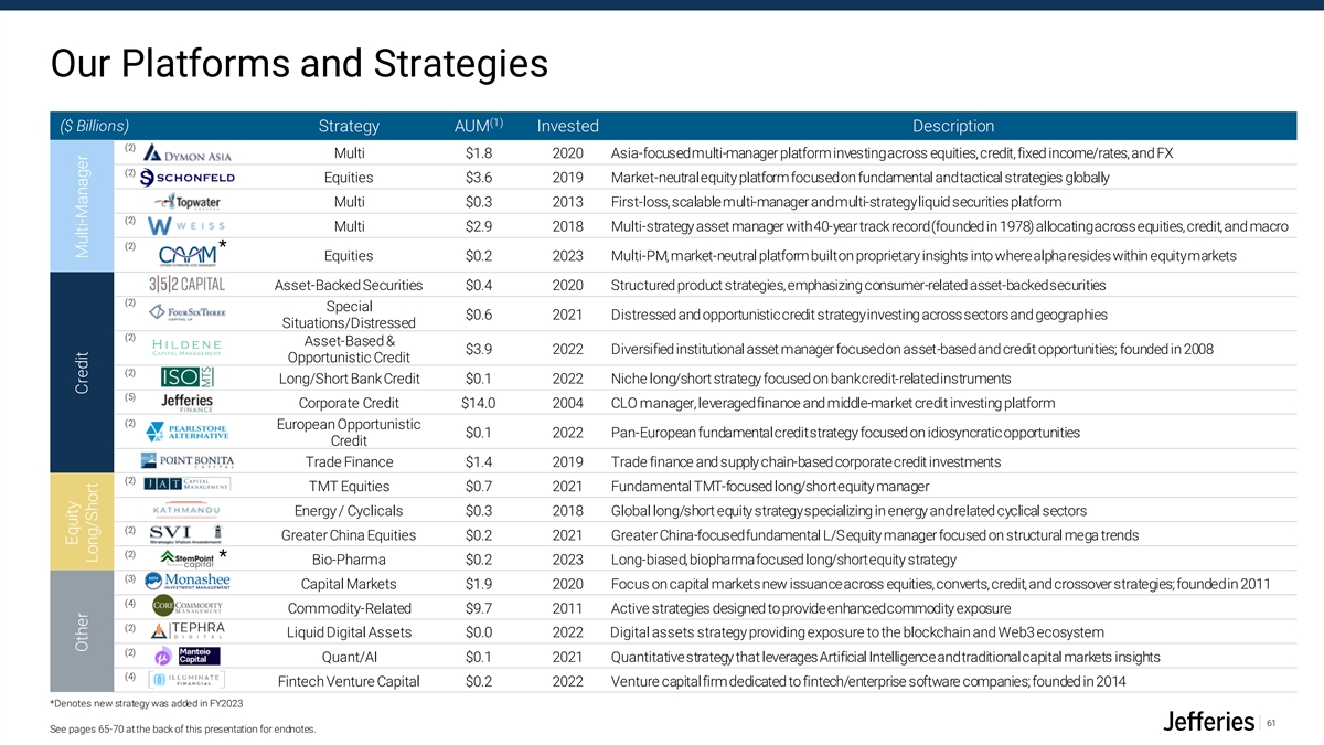 Our Platforms and Strategies (1) ($ Billions) Strategy AUM Invested Description (2) Multi $1.8 2020 Asia-focused multi-manager platform investing across equities, credit, fixed income/rates, and FX (2) Equities $3.6 2019 Market-neutral equity platform focused on fundamental and tactical strategies globally Multi $0.3 2013 First-loss, scalable multi-manager and multi-strategy liquid securities platform (2) Multi $2.9 2018 Multi-strategy asset manager with 40-year track record (founded in 1978) allocating across equities, credit, and macro (2) * Equities $0.2 2023 Multi-PM, market-neutral platform built on proprietary insights into where alpha resides within equity markets Asset-Backed Securities $0.4 2020 Structured product strategies, emphasizing consumer-related asset-backed securities (2) Special $0.6 2021 Distressed and opportunistic credit strategy investing across sectors and geographies Situations/Distressed (2) Asset-Based & $3.9 2022 Diversified institutional asset manager focused on asset-based and credit opportunities; founded in 2008 Opportunistic Credit (2) Long/Short Bank Credit $0.1 2022 Niche long/short strategy focused on bank credit-related instruments (5) Corporate Credit $14.0 2004 CLO manager, leveraged finance and middle-market credit investing platform (2) European Opportunistic $0.1 2022 Pan-European fundamental credit strategy focused on idiosyncratic opportunities Credit Trade Finance $1.4 2019 Trade finance and supply chain-based corporate credit investments (2) TMT Equities $0.7 2021 Fundamental TMT-focused long/short equity manager Energy / Cyclicals $0.3 2018 Global long/short equity strategy specializing in energy and related cyclical sectors (2) Greater China Equities $0.2 2021 Greater China-focused fundamental L/S equity manager focused on structural mega trends (2) * Bio-Pharma $0.2 2023 Long-biased, biopharma focused long/short equity strategy (3) Capital Markets $1.9 2020 Focus on capital markets new issuance across equities, converts, credit, and crossover strategies; founded in 2011 (4) Commodity-Related $9.7 2011 Active strategies designed to provide enhanced commodity exposure (2) Liquid Digital Assets $0.0 2022 Digital assets strategy providing exposure to the blockchain and Web3 ecosystem (2) Quant/AI $0.1 2021 Quantitative strategy that leverages Artificial Intelligence and traditional capital markets insights (4) Fintech Venture Capital $0.2 2022 Venture capital firm dedicated to fintech/enterprise software companies; founded in 2014 *Denotes new strategy was added in FY2023 61 See pages 65-70 at the back of this presentation for endnotes. Equity Other Credit Multi-Manager Long/Short