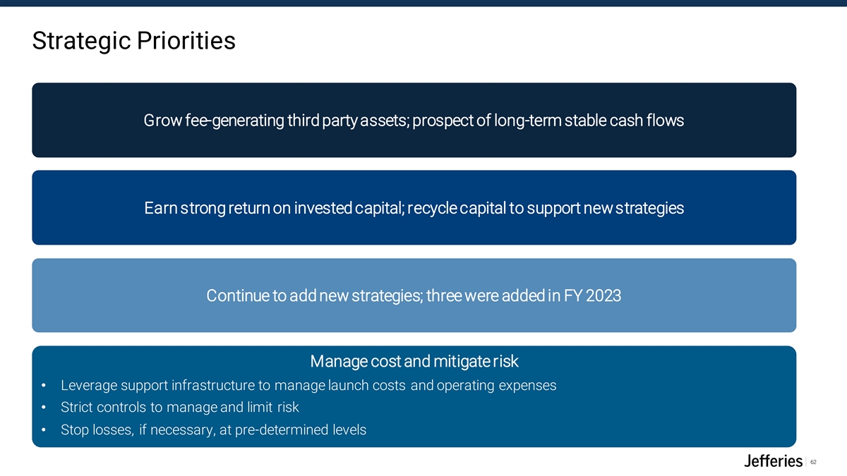 Strategic Priorities Grow fee-generating third party assets; prospect of long-term stable cash flows Earn strong return on invested capital; recycle capital to support new strategies Continue to add new strategies; three were added in FY 2023 Manage cost and mitigate risk • Leverage support infrastructure to manage launch costs and operating expenses • Strict controls to manage and limit risk • Stop losses, if necessary, at pre-determined levels 62