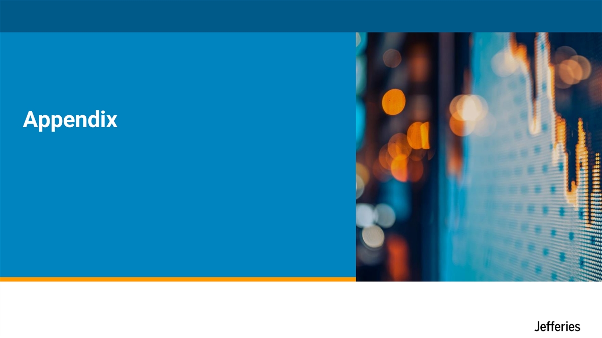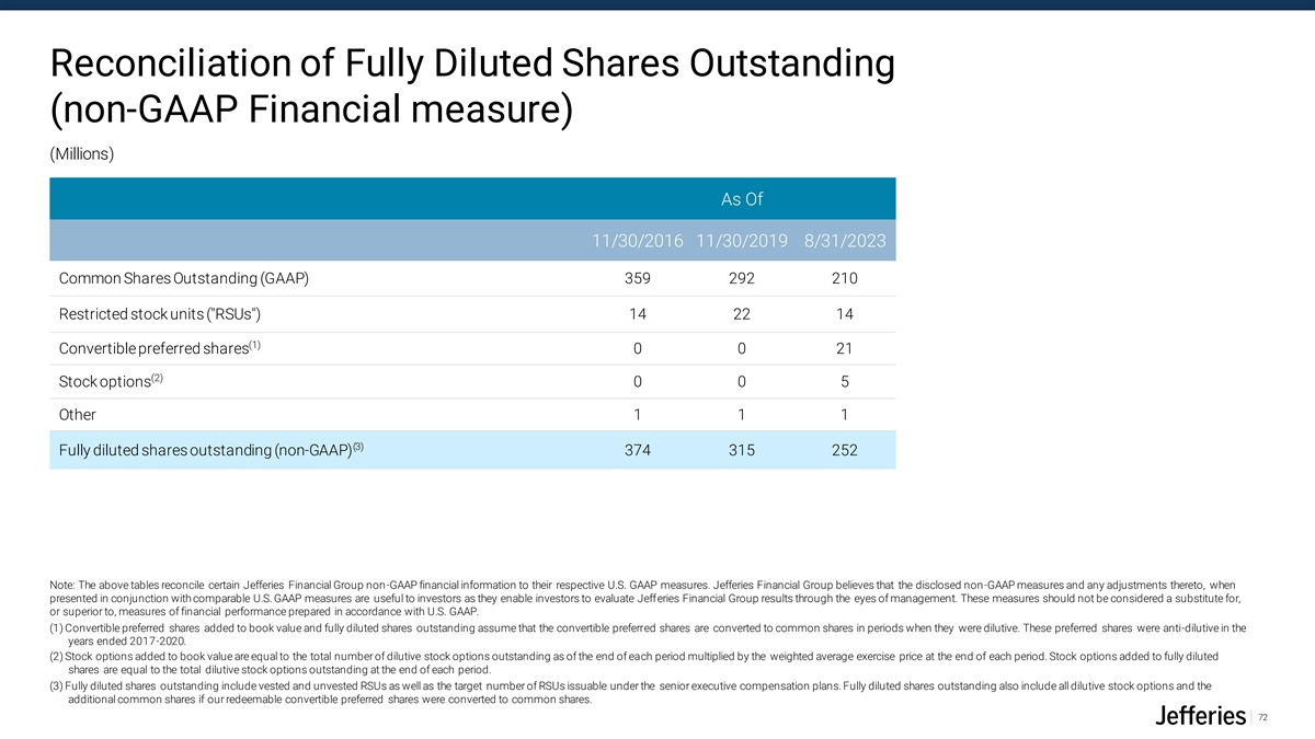 Reconciliation of Fully Diluted Shares Outstanding (non-GAAP Financial measure) ($ Millions except Per Share Amount) (Millions) As Of 11/30/2016 11/30/2019 8/31/2023 Common Shares Outstanding (GAAP) 359 292 210 Restricted stock units ( RSUs ) 14 22 14 (1) Convertible preferred shares 0 0 21 (2) Stock options 0 0 5 Other 1 1 1 Note: The above tables reconcile certain Jefferies Financial Group non-GAAP financial information to their (3) respective U.S. GAAP measures. Jefferies Financial Group believes that the disclosed non-GAAP measures and Fully diluted shares outstanding (non-GAAP) 374 315 252 any adjustments thereto, when presented in conjunction with comparable U.S. GAAP measures are useful to investors as they enable investors to evaluate Jefferies Financial Group results through the eyes of management. These measures should not be considered a substitute for, or superior to, measures of financial performance prepared in accordance with U.S. GAAP. Note: The above tables reconcile certain Jefferies Financial Group non-GAAP financial information to their respective U.S. GAAP measures. Jefferies Financial Group believes that the disclosed non-GAAP measures and any adjustments thereto, when presented in conjunction with comparable U.S. GAAP measures are useful to investors as they enable investors to evaluate Jefferies Financial Group results through the eyes of management. These measures should not be considered a substitute for, or superior to, measures of financial performance prepared in accordance with U.S. GAAP. (1) Convertible preferred shares added to book value and fully diluted shares outstanding assume that the convertible preferred shares are converted to common shares in periods when they were dilutive. These preferred shares were anti-dilutive in the years ended 2017-2020. (2) Stock options added to book value are equal to the total number of dilutive stock options outstanding as of the end of each period multiplied by the weighted average exercise price at the end of each period. Stock options added to fully diluted shares are equal to the total dilutive stock options outstanding at the end of each period. (3) Fully diluted shares outstanding include vested and unvested RSUs as well as the target number of RSUs issuable under the senior executive compensation plans. Fully diluted shares outstanding also include all dilutive stock options and the additional common shares if our redeemable convertible preferred shares were converted to common shares. 72