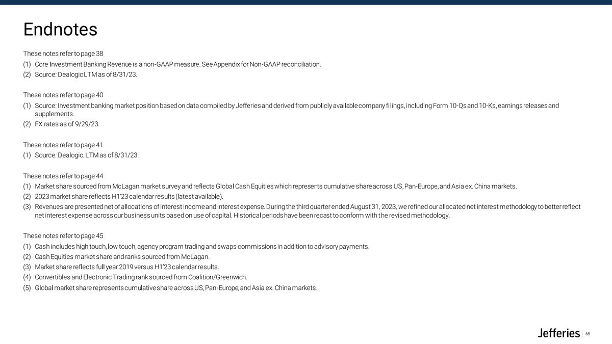 Endnotes These notes refer to page 28 (1) Core Investment Banking Revenue is a non-GAAP measure. See Appendix for Non-GAAP reconciliation. (2) Revenues are presented net of allocations of interest income and interest expense. During the third quarter ended August 31, 2023, we refined our allocated net interest methodology to better reflect net interest expense across our business units based on use of capital. Historical periods have been recast to conform with the revised methodology. These notes refer to page 30 (1) Source of data: Bloomberg. (2) Peer group defined as: BAC, C, GS, JPM, MS. (3) Annualization calculation: Q1 Dividend + Q2 Dividend + Q3 Dividend + Q3 Dividend = Annualized 2023. These notes refer to page 31 (1) Fully diluted shares outstanding at end of each period. Fully diluted shares outstanding, a non-GAAP measure, is defined as Jefferies Financial Group’s common shares outstanding plus restricted stock units, stock options, conversion of redeemable preferred shares and other shares. See Appendix for non-GAAP reconciliation. These notes refer to page 32 (1) As of November 30, 2022, certain reclassifications were made within the Consolidated Statement of Earnings to present Income from associated companies and Interest expense within Net revenues. Net revenues, for purposes of calculating Revenue per Head, has been recast to conform to this presentation. These notes refer to page 33 (1) Transaction & Client Related Costs include the following expenses: Business Development, Cost of Sales, Brokerage Clearing & Exchange Fees and Underwriting Fees. These notes refer to page 34 (1) See Appendix for reconciliation to GAAP amount. These notes refer to page 37 (1) Headcount as of period end 8/31/23. (2) Source: Dealogic. FYTD as of 8/31/23. (3) APAC excludes China. 67