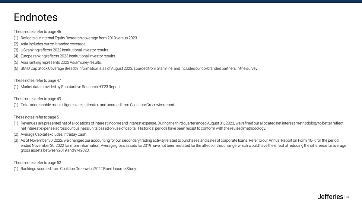 Endnotes These notes refer to page 38 (1) Core Investment Banking Revenue is a non-GAAP measure. See Appendix for Non-GAAP reconciliation. (2) Source: Dealogic LTM as of 8/31/23. These notes refer to page 40 (1) Source: Investment banking market position based on data compiled by Jefferies and derived from publicly available company filings, including Form 10-Qs and 10-Ks, earnings releases and supplements. (2) FX rates as of 9/29/23. These notes refer to page 41 (1) Source: Dealogic. LTM as of 8/31/23. These notes refer to page 44 (1) Market share sourced from McLagan market survey and reflects Global Cash Equities which represents cumulative share across US, Pan-Europe, and Asia ex. China markets. (2) 2023 market share reflects H1’23 calendar results (latest available). (3) Revenues are presented net of allocations of interest income and interest expense. During the third quarter ended August 31, 2023, we refined our allocated net interest methodology to better reflect net interest expense across our business units based on use of capital. Historical periods have been recast to conform with the revised methodology. These notes refer to page 45 (1) Cash includes high touch, low touch, agency program trading and swaps commissions in addition to advisory payments. (2) Cash Equities market share and ranks sourced from McLagan. (3) Market share reflects full year 2019 versus H1’23 calendar results. (4) Convertibles and Electronic Trading rank sourced from Coalition/Greenwich. (5) Global market share represents cumulative share across US, Pan-Europe, and Asia ex. China markets. 68