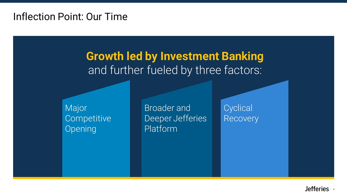 The Jefferies Difference Jefferies is one of the world’s leading investment banking and capital market firms We believe our success is grounded in our balance of extreme urgency and long-term perspective. We know there is no shortcut to building our capabilities and client base. We have patiently built Jefferies and our culture around: T H R E E P I L L A R S T H R E E P I L L A R S Relentless Differentiated A Flat and Nimble Client Focus Insights Operating Structure 5