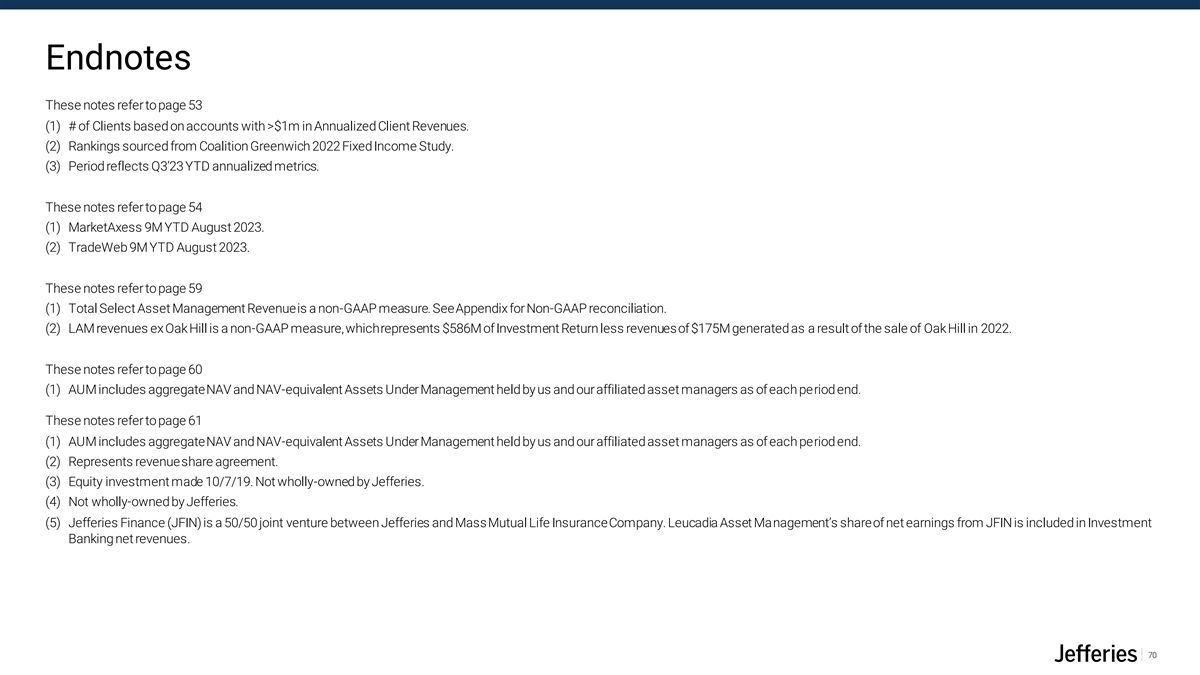 Endnotes These notes refer to page 53 (1) # of Clients based on accounts with >$1m in Annualized Client Revenues. (2) Rankings sourced from Coalition Greenwich 2022 Fixed Income Study. (3) Period reflects Q3’23 YTD annualized metrics. These notes refer to page 54 (1) MarketAxess 9M YTD August 2023. (2) TradeWeb 9M YTD August 2023. These notes refer to page 59 (1) Total Select Asset Management Revenue is a non-GAAP measure. See Appendix for Non-GAAP reconciliation. (2) LAM revenues ex Oak Hill is a non-GAAP measure, which represents $586M of Investment Return less revenues of $175M generated as a result of the sale of Oak Hill in 2022. These notes refer to page 60 (1) AUM includes aggregate NAV and NAV-equivalent Assets Under Management held by us and our affiliated asset managers as of each period end. These notes refer to page 61 (1) AUM includes aggregate NAV and NAV-equivalent Assets Under Management held by us and our affiliated asset managers as of each period end. (2) Represents revenue share agreement. (3) Equity investment made 10/7/19. Not wholly-owned by Jefferies. (4) Not wholly-owned by Jefferies. (5) Jefferies Finance (JFIN) is a 50/50 joint venture between Jefferies and Mass Mutual Life Insurance Company. Leucadia Asset Management’s share of net earnings from JFIN is included in Investment Banking net revenues. 70