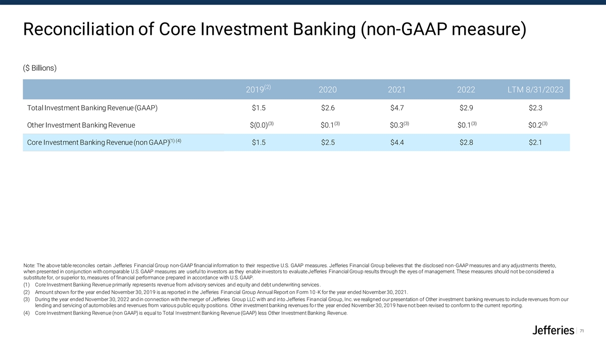 Reconciliation of Core Investment Banking (non-GAAP measure) ($ Billions) (2) 2019 2020 2021 2022 LTM 8/31/2023 Total Investment Banking Revenue (GAAP) $1.5 $2.6 $4.7 $2.9 $2.3 (3) (3) (3) (3) (3) Other Investment Banking Revenue $(0.0) $0.1 $0.3 $0.1 $0.2 (1) (4) Core Investment Banking Revenue (non GAAP) $1.5 $2.5 $4.4 $2.8 $2.1 Note: The above table reconciles certain Jefferies Financial Group non-GAAP financial information to their respective U.S. GAAP measures. Jefferies Financial Group believes that the disclosed non-GAAP measures and any adjustments thereto, when presented in conjunction with comparable U.S. GAAP measures are useful to investors as they enable investors to evaluateJefferies Financial Group results through the eyes of management. These measures should not be considered a substitute for, or superior to, measures of financial performance prepared in accordance with U.S. GAAP. (1) Core Investment Banking Revenue primarily represents revenue from advisory services and equity and debt underwriting services. (2) Amount shown for the year ended November 30, 2019 is as reported in the Jefferies Financial Group Annual Report on Form 10 -K for the year ended November 30, 2021. (3) During the year ended November 30, 2022 and in connection with the merger of Jefferies Group LLC with and into Jefferies Financial Group, Inc. we realigned our presentation of Other investment banking revenues to include revenues from our lending and servicing of automobiles and revenues from various public equity positions. Other investment banking revenues fo r the year ended November 30, 2019 have not been revised to conform to the current reporting. (4) Core Investment Banking Revenue (non GAAP) is equal to Total Investment Banking Revenue (GAAP) less Other Investment Banking Revenue. 71