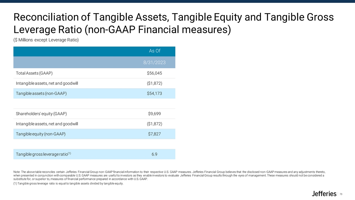 Reconciliation of Tangible Assets, Tangible Equity and Tangible Gross Leverage Ratio (non-GAAP Financial measures) ($ Millions except Leverage Ratio) As Of 8/31/2023 Total Assets (GAAP) $56,045 Intangible assets, net and goodwill ($1,872) Tangible assets (non-GAAP) $54,173 Note: The above tables reconcile certain Jefferies Financial Group non-GAAP financial information Shareholders' equity (GAAP) $9,699 to their respective U.S. GAAP measures. Jefferies Financial Group believes that the disclosed non- Intangible assets, net and goodwill ($1,872) GAAP measures and any adjustments thereto, when presented in conjunction with comparable Tangible equity (non-GAAP) $7,827 U.S. GAAP measures are useful to investors as they enable investors to evaluate Jefferies Financial Group results through the eyes of management. These measures should not be considered a (1) Tangible gross leverage ratio 6.9 substitute for, or superior to, measures of financial performance prepared in accordance with U.S. GAAP. Note: The above table reconciles certain Jefferies Financial Group non-GAAP financial information to their respective U.S. GAAP measures. Jefferies Financial Group believes that the disclosed non-GAAP measures and any adjustments thereto, when presented in conjunction with comparable U.S. GAAP measures are useful to investors as they enable investors to evaluate Jefferies Financial Group results through the eyes of management. These measures should not be considered a substitute for, or superior to, measures of financial performance prepared in accordance with U.S. GAAP. (1) Tangible gross leverage ratio is equal to tangible assets divided by tangible equity. 73