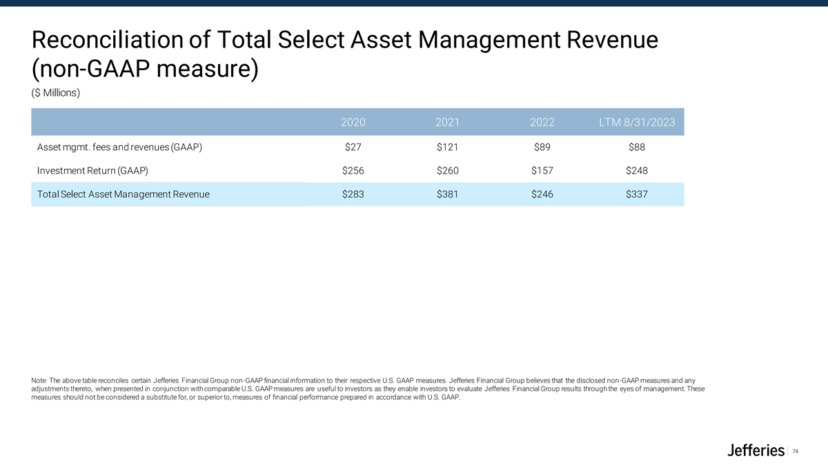 Reconciliation of Total Select Asset Management Revenue (non-GAAP measure) ($ Millions) 2020 2021 2022 LTM 8/31/2023 Asset mgmt. fees and revenues (GAAP) $27 $121 $89 $88 Investment Return (GAAP) $256 $260 $157 $248 Total Select Asset Management Revenue $283 $381 $246 $337 Note: The above table reconciles certain Jefferies Financial Group non-GAAP financial information to their respective U.S. GAAP measures. Jefferies Financial Group believes that the disclosed non-GAAP measures and any adjustments thereto, when presented in conjunction with comparable U.S. GAAP measures are useful to investors as they enable investors to evaluate Jefferies Financial Group results through the eyes of management. These measures should not be considered a substitute for, or superior to, measures of financial performance prepared in accordance with U.S. GAAP. 74