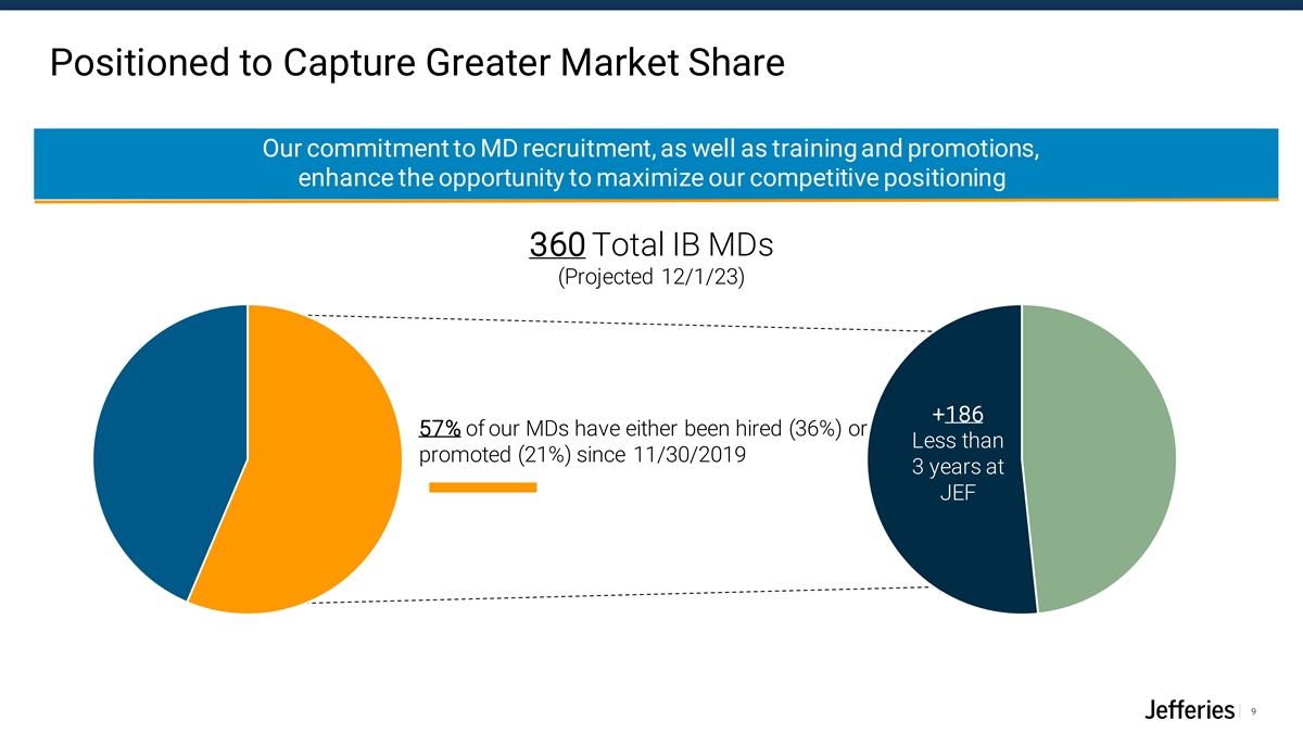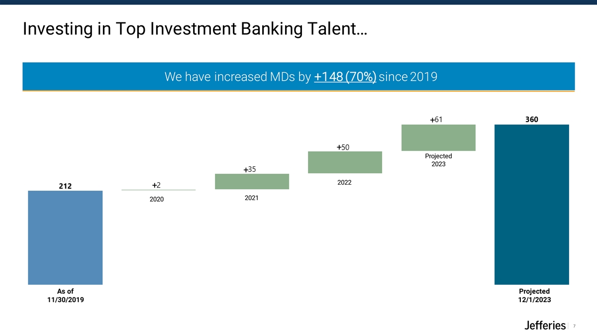 Investing in Top Investment Banking Talent… We have increased MDs by +148 (70%) since 2019 + + Projected 2023 + 2022 + 2021 2020 As of Projected 11/30/2019 12/1/2023 7