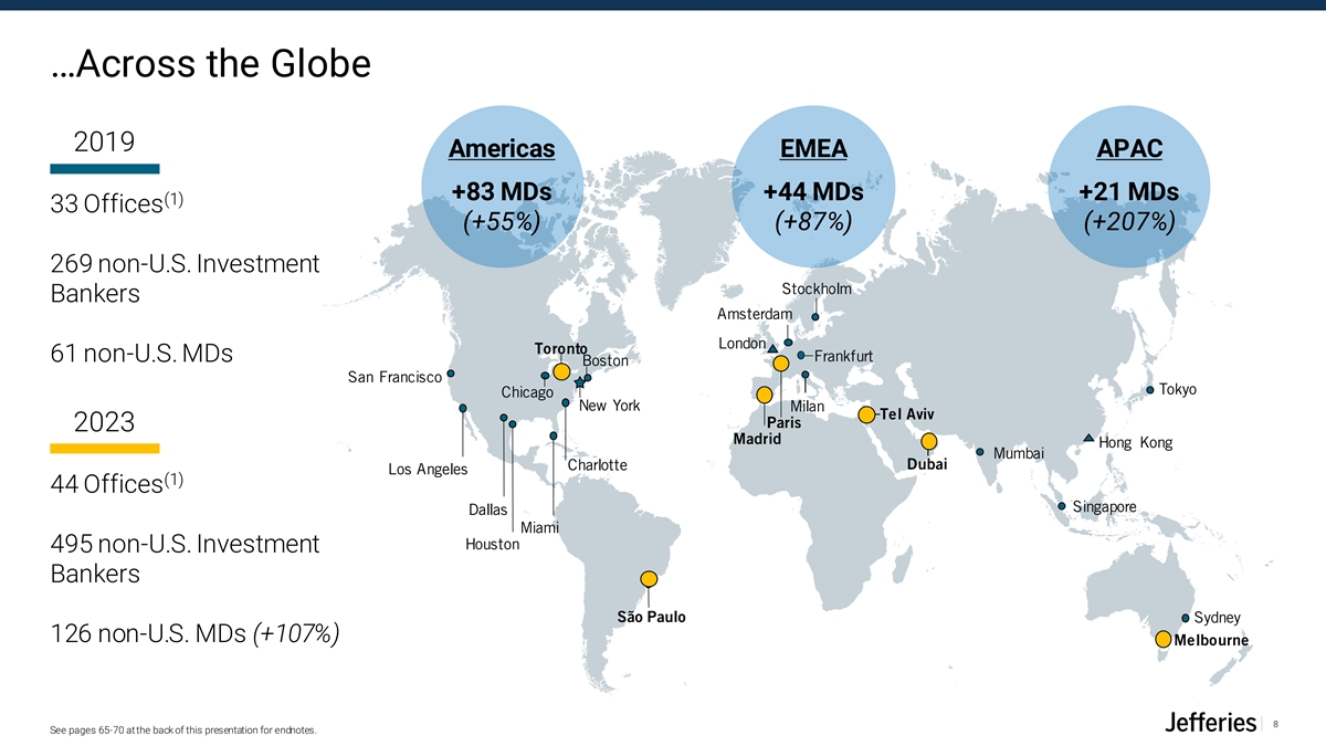 …Across the Globe 2019 Americas EMEA APAC +83 MDs +44 MDs +21 MDs (1) 33 Offices (+55%) (+87%) (+207%) 269 non-U.S. Investment Stockholm Bankers Amsterdam London Toronto 61 non-U.S. MDs Frankfurt Boston San Francisco Tokyo Chicago New York Milan Tel Aviv Paris 2023 Madrid Hong Kong Mumbai Dubai Charlotte Los Angeles (1) 44 Offices Singapore Dallas Miami Houston 495 non-U.S. Investment Bankers São Paulo Sydney 126 non-U.S. MDs (+107%) Melbourne 8 See pages 65-70 at the back of this presentation for endnotes.