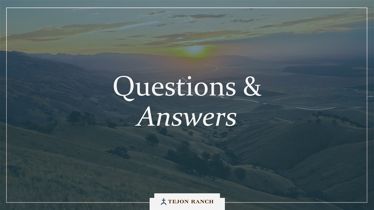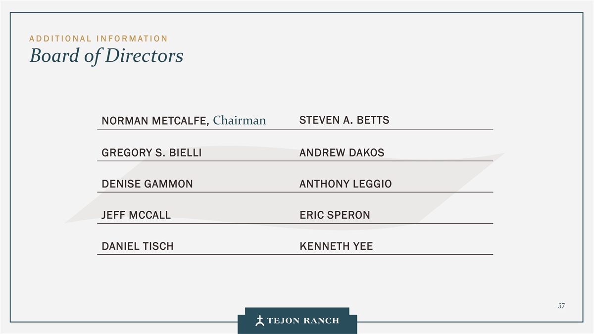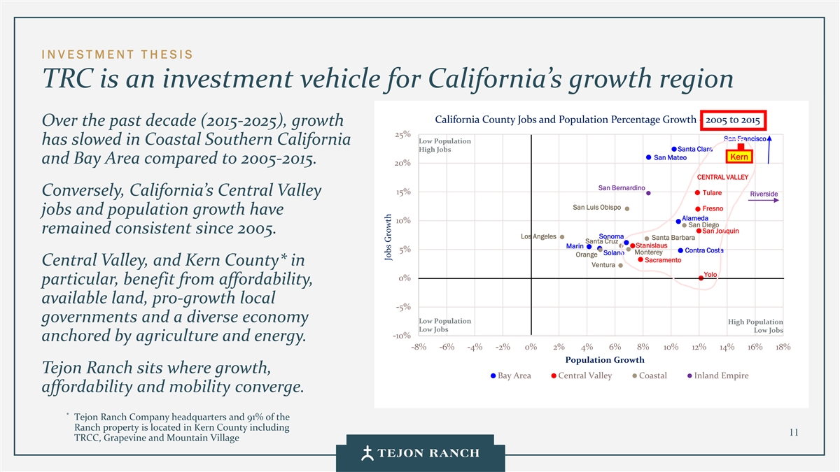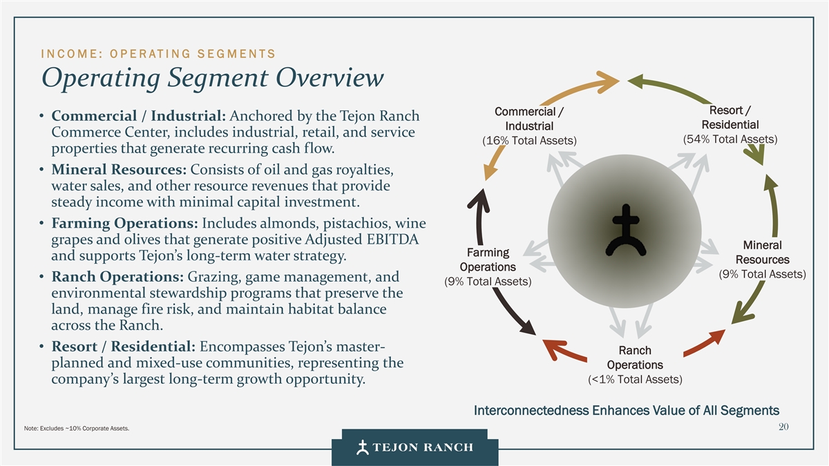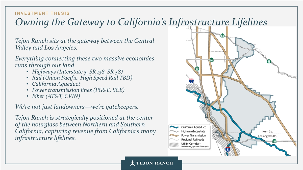 Disclaimer Safe Harbor Statement This presentation contains forward-looking statements within the meaning of the federal securities laws. Generally speaking, any statement not based upon historical fact is a forward-looking statement. In particular, statements regarding the Company’s business plans, strategies, prospects, objectives, milestones, future operating results, financial condition, expectations regarding capital allocation, cost savings, share repurchases, entitlement and development timelines, partnerships, regulatory reforms, and other future events or circumstances are forward-looking statements. These statements reflect the Company’s current expectations and beliefs about future developments and their potential effects on the Company. Forward-looking statements are not guarantees of performance and speak only as of the date of this letter. Words such as “anticipate,” “believe,” “estimate,” “expect,” “intend,” “plan,” “project,” “target,” “can,” “could,” “may,” “will,” “should,” “would,” “likely,” “improve,” “commit,” and similar expressions, as well as discussions of strategy, objectives, and intentions, are intended to identify forward-looking statements. These statements are based on current assumptions and involve known and unknown risks, uncertainties, and other factors—many of which are beyond the Company’s control—that could cause actual results to differ materially from those expressed or implied. Such factors include, but are not limited to, market, economic, geopolitical and weather conditions; the availability and cost of financing for land development and other activities; competition; commodity prices and agricultural yields; success in obtaining and maintaining governmental entitlements and permits; the timing and outcome of regulatory or litigation processes; demand for commercial, industrial, residential, and retail real estate; and other risks inherent in real estate and agricultural operations. No assurance can be given that actual results will not differ materially from those expressed or implied by these forward-looking statements. Except as required by law, the Company undertakes no obligation to update or revise any forward- looking statement as a result of new information, future events, or otherwise. Investors are cautioned not to place undue reliance on these forward-looking statements. For a discussion of risks and uncertainties that could cause actual results to differ, please refer to the Company’s Annual Report on Form 10-K for the fiscal year ended December 31, 2024, and subsequent filings with the U.S. Securities and Exchange Commission. Non-GAAP Financial Measures Adjusted EBITDA: We use Adjusted EBITDA to assess the performance of our core operations, for financial and operational decision making, and as a supplemental or additional means of evaluating period-to-period comparisons on a consistent basis. Adjusted EBITDA is calculated as EBITDA (earnings before interest, taxes, depreciation, and amortization), excluding stock compensation expense. We believe Adjusted EBITDA provides investors relevant and useful information because it permits investors to view income from our operations on an unleveraged basis, before the effects of taxes, depreciation and amortization, and stock compensation expense. By excluding interest expense and income, EBITDA and Adjusted EBITDA allow investors to measure our performance independent of our capital structure and indebtedness and, therefore, allow for a more meaningful comparison of our performance to that of other companies, both in the real estate industry and in other industries. We believe that excluding charges related to share-based compensation facilitates a comparison of our operations across periods and among other companies without the variances caused by different valuation methodologies, the volatility of the expense (which depends on market forces outside our control), and the assumptions and the variety of award types that a company can use. Quantitative reconciliation of historical measures of Adjusted EBITDA to net income, which is the most directly comparable GAAP measure, is provided on a previous slide. TRCC Net Asset Value (NAV) Per Share: The inputs used in calculating NAV are derived from publicly available disclosures and third-party market data. Tejon Ranch Co.’s share of depreciation and interest expense for unconsolidated joint ventures, as disclosed in the Company’s SEC filings, was used to estimate Net Operating Income (“NOI”) attributable to its 50/50 joint ventures, excluding the TA/Petro investments. Cap rates applied to the NOI are based on average market rates for industrial and retail assets published in the most recent PwC Real Estate Investor Survey. Land value assumptions, including the $1,500 per acre estimate, reflect legacy benchmarks historically applied to quality grazing land. Due to the aggregation of NOI for outlet and industrial assets in the disclosures, a uniform cap rate was applied across both asset types for valuation purposes. We believe TTRCC NAV Per Share is useful to shareholders because it illustrates the current value of our strategic assets, and management uses this measure to evaluate contribution of TRCC relative to overall company NAV. Other companies may calculate NAV and measures associated with it differently. We do not believe there is a directly comparable GAAP measure to TRCC NAV Per Share. Net Debt / Adjusted EBITDA: We use Net Debt / Adjusted EBITDA as a non-GAAP financial measure to evaluate our capital structure and ability to service our debt. Management believes this ratio provides useful insight into leverage trends and capital efficiency. Net debt includes TRC debt and the company’s pro rata share of debt held at unconsolidated joint ventures, offset by consolidated and pro rata cash. Adjusted EBITDA is used as a proxy for core operating perfor