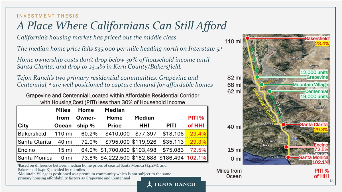 I N VESTMENT T H ESIS A Place Where Californians Can Still Afford California’s housing market has priced out the middle class. Bakersfield 110 mi 23.4% 1 The median home price falls $35,000 per mile heading north on Interstate 5. Home ownership costs don’t drop below 30% of household income until Santa Clarita, and drop to 23.4% in Kern County/Bakersfield. 12,000 units Grapevine Tejon Ranch’s two primary residential communities, Grapevine and 82 mi 2 Mountain Village Centennial, are well positioned to capture demand for affordable homes 68 mi 62 mi Centennial Grapevine and Centennial Located within Affordable Residential Corridor 19,000 units with Housing Cost (PITI) less than 30% of Household Income Miles Home Median from Owner- Home Median PITI % Santa Clarita City Ocean ship % Price HHI PITI of HHI 40 mi 29.3% Bakersfield 110 mi 60.2% $410,000 $77,397 $18,108 23.4% Santa Clarita 40 mi 72.0% $795,000 $119,926 $35,113 29.3% Encino 72.5% Encino 15 mi 64.0% $1,700,000 $103,498 $75,083 72.5% 15 mi Santa Monica Santa Monica 0 mi 73.8% $4,222,500 $182,688 $186,494 102.1% 0 mi 102.1% 1 Based on difference between median home prices of coastal Santa Monica ($4.2M), and Bakersfield ($410K) divided by 110 miles Miles from PITI % 1 Mountain Village is positioned as a premium community which is not subject to the same Ocean of HHI primary housing affordability factors as Grapevine and Centennial 13