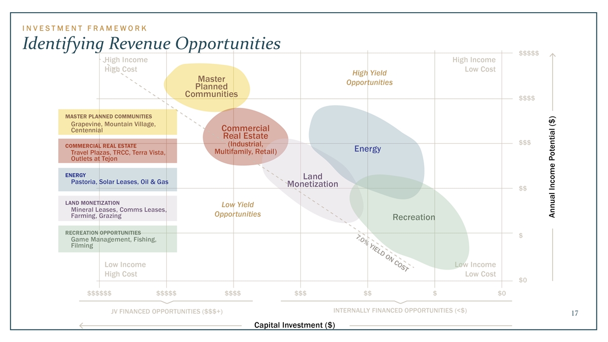 I N VESTMENT F R AMEWORK Hurdle Rates: Investment Performance Scorecard THE VAST MAJORITY OF CAPITAL DEPLOYED INTO IMPLEMENTED PROJECTS HAS GENERATED RESULTS WHICH EXCEED THE HURDLE RATES, VALIDATING THE DISCIPLINE OF OUR APPROACH Current Return on Equity Yield Equity Unlev IRR Lev IRR Multiple Hurdle Rate Threshold 7.0% 13.0% 12.0% 18.0% 1.50 Industrial - MRC-1 JV Existing investments Industrial - MRC-2 JV each achieve 7.0% yield, Industrial - MRC-3 JV Industrial - MRC-4 JV 13.0% ROE and 12.0% Industrial - MRC-5 JV UIRR hurdles TA-Petro JV Pastoria Energy Facility TRCC Real Estate Outlets at Tejon and Other Commercial Real Estate Terra Vista Apartments Communications carry strategic Outlets at Tejon JV Terra Vista Apartments importance, create demand and drive land Meets Hurdle value premiums Does Not Meet Hurdle throughout TRCC Not Applicable to Hurdle 16