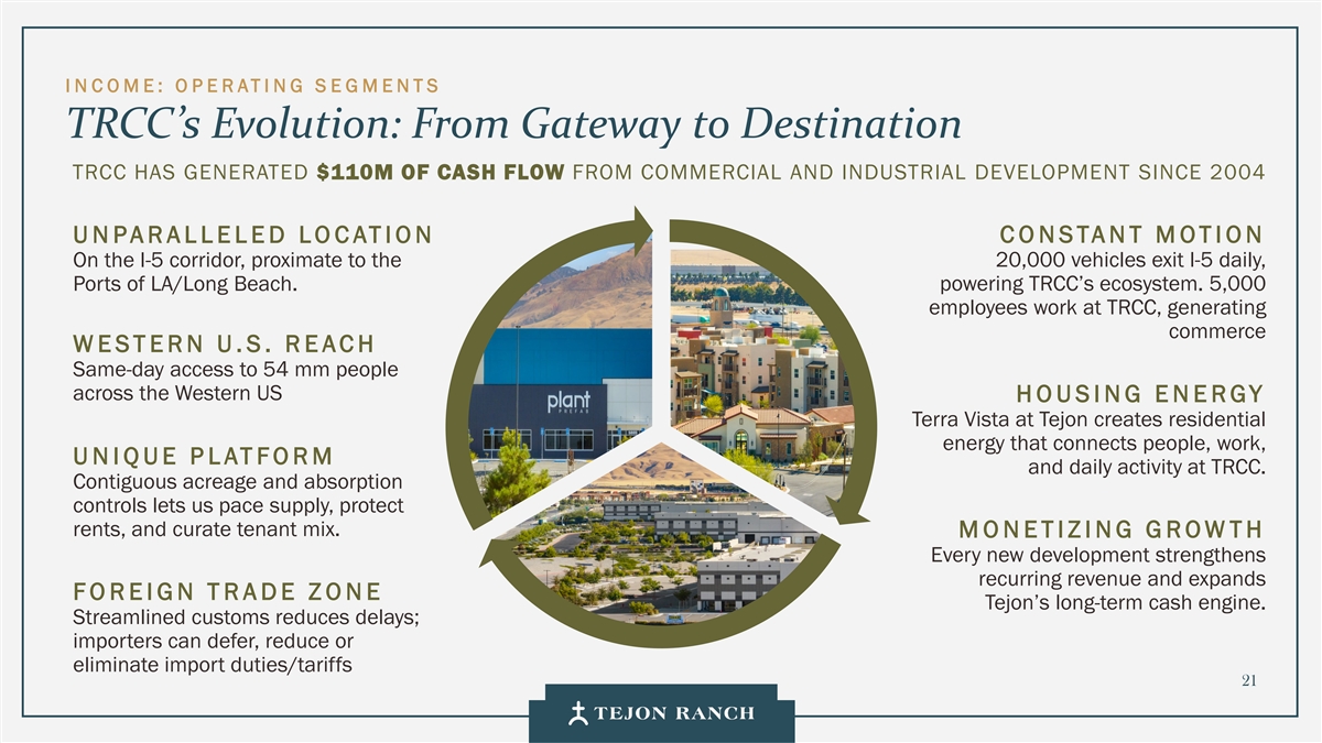 I N C OME: O P E RATI NG S E GMENTS Operating Segment Overview Resort / Commercial / • Commercial / Industrial: Anchored by the Tejon Ranch Residential Industrial Commerce Center, includes industrial, retail, and service (54% Total Assets) (16% Total Assets) properties that generate recurring cash flow. • Mineral Resources: Consists of oil and gas royalties, water sales, and other resource revenues that provide steady income with minimal capital investment. • Farming Operations: Includes almonds, pistachios, wine grapes and olives that generate positive Adjusted EBITDA Mineral Farming and supports Tejon’s long-term water strategy. Resources Operations (9% Total Assets) • Ranch Operations: Grazing, game management, and (9% Total Assets) environmental stewardship programs that preserve the land, manage fire risk, and maintain habitat balance across the Ranch. • Resort / Residential: Encompasses Tejon’s master- Ranch planned and mixed-use communities, representing the Operations (<1% Total Assets) company’s largest long-term growth opportunity. Interconnectedness Enhances Value of All Segments Note: Excludes ~10% Corporate Assets. 20