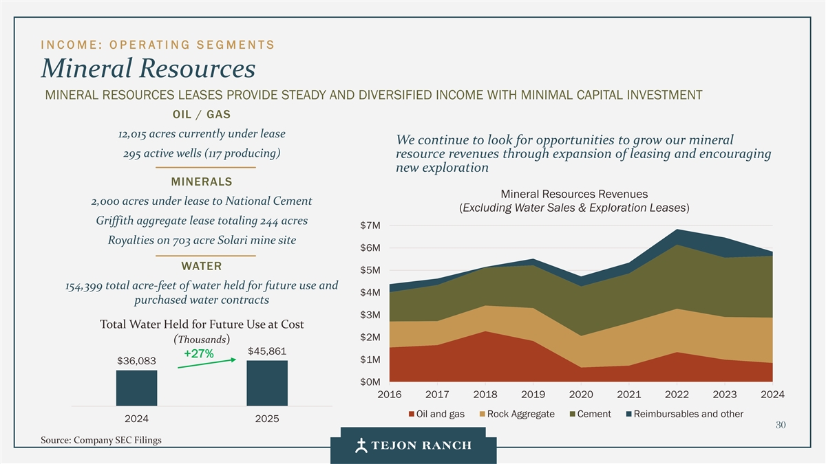 I N C OME: O P E RATI NG S E GMENTS Mineral Resources MINERAL RESOURCES LEASES PROVIDE STEADY AND DIVERSIFIED INCOME WITH MINIMAL CAPITAL INVESTMENT OIL / GAS 12,015 acres currently under lease We continue to look for opportunities to grow our mineral 295 active wells (117 producing) resource revenues through expansion of leasing and encouraging new exploration MINERALS Mineral Resources Revenues 2,000 acres under lease to National Cement (Excluding Water Sales & Exploration Leases) Griffith aggregate lease totaling 244 acres $7M Royalties on 703 acre Solari mine site $6M WATER $5M 154,399 total acre-feet of water held for future use and $4M purchased water contracts $3M Total Water Held for Future Use at Cost $2M (Thousands) $45,861 +27% $1M $36,083 $0M 2016 2017 2018 2019 2020 2021 2022 2023 2024 Oil and gas Rock Aggregate Cement Reimbursables and other 2024 2025 30 Source: Company SEC Filings