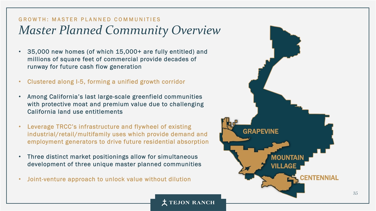 G ROW TH: M A STER P L A N NED C O MMUNITIES The Case for the MPCs COMPANY RESPONSES INVESTOR CONCERNS Entitlements have created significant value to date with Significant capital spent to date without protective moat of value given lengthy California process and any construction uncertain timing Perception that entitlements have been Approval timeframes are within reasonable parameters unsuccessful and not valuable Company is flexible and always considering strategic Lack of clarity on future time schedule alternatives Projects are potentially dilutive to Pursuing capitalization of MPC’s through JV’s to avoid dilution shareholders Investment consideration requires customized approach for Perception that MPC funding is at the expense each community, not a blanket strategy or one size fits all of more deserving TRCC investments The economics are compelling. Delivering a high teens or Perception that go forward economics aren’t better JV return over 10 to 20 years is extremely attractive. compelling Belief that Company should sell Mountain Village Company must do a better job to provide more clarity and Centennial land and distribute dividends, about costs and timing repurchase stock and/or invest in TRCC 34