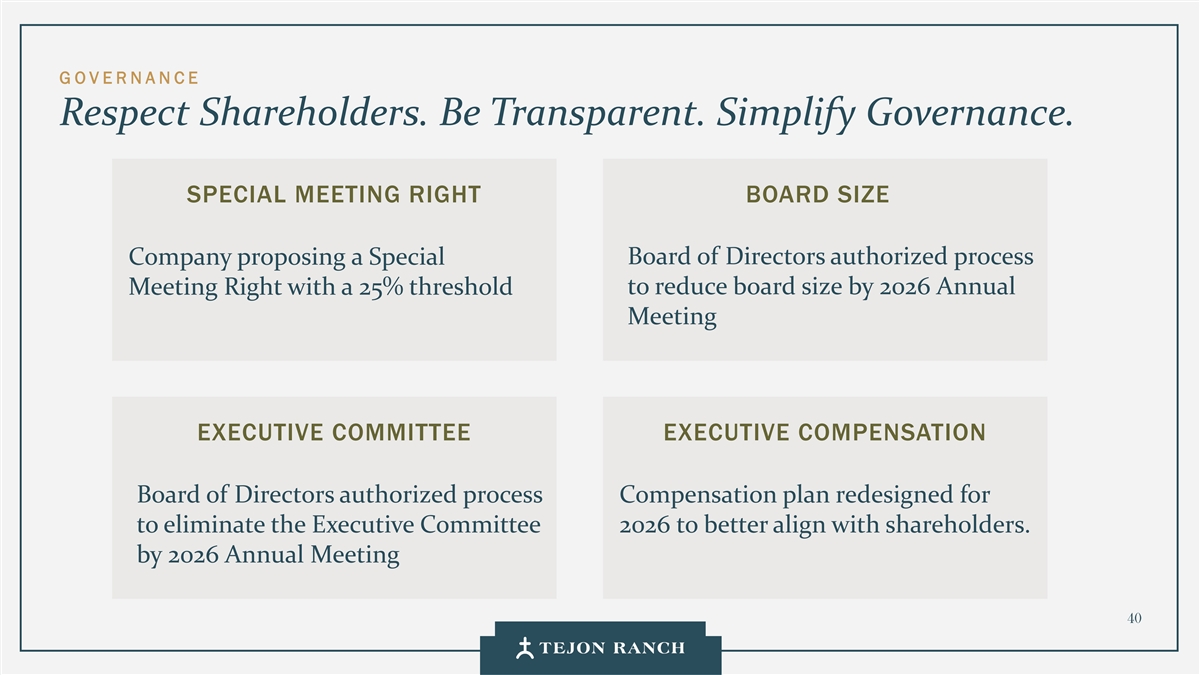 G O VE R NA NC E Respect Shareholders. Be Transparent. Simplify Governance. SPECIAL MEETING RIGHT BOARD SIZE Company proposing a Special Board of Directors authorized process Meeting Right with a 25% threshold to reduce board size by 2026 Annual Meeting EXECUTIVE COMMITTEE EXECUTIVE COMPENSATION Board of Directors authorized process Compensation plan redesigned for to eliminate the Executive Committee 2026 to better align with shareholders. by 2026 Annual Meeting 40