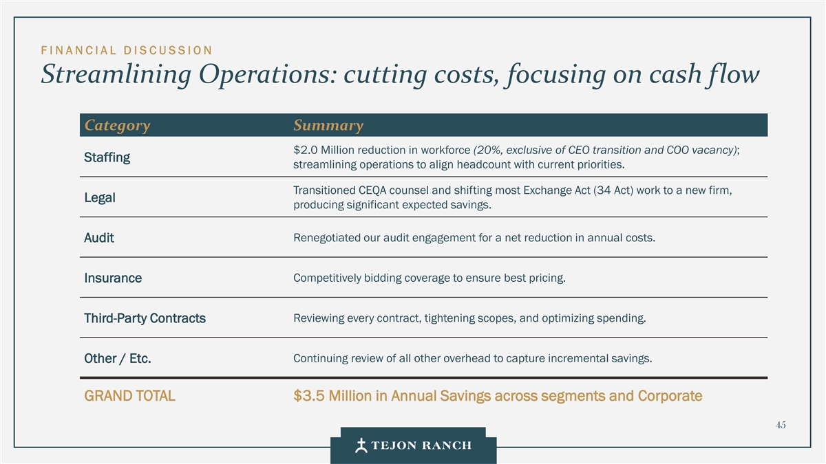 F I N ANCIAL D I S CUSSION Streamlining Operations: cutting costs, focusing on cash flow Category Summary $2.0 Million reduction in workforce (20%, exclusive of CEO transition and COO vacancy); Staffing streamlining operations to align headcount with current priorities. Transitioned CEQA counsel and shifting most Exchange Act (34 Act) work to a new firm, Legal producing significant expected savings. Renegotiated our audit engagement for a net reduction in annual costs. Audit Competitively bidding coverage to ensure best pricing. Insurance Reviewing every contract, tightening scopes, and optimizing spending. Third-Party Contracts Other / Etc. Continuing review of all other overhead to capture incremental savings. GRAND TOTAL $3.5 Million in Annual Savings across segments and Corporate 45