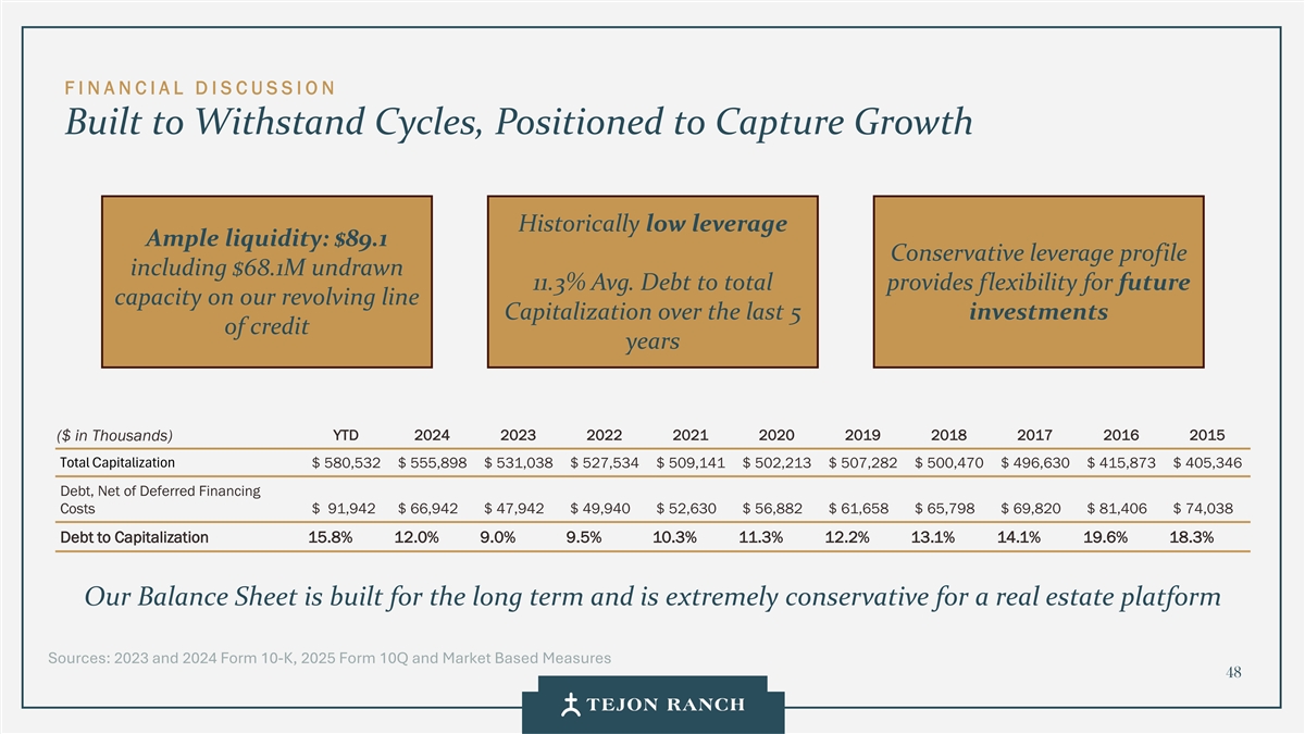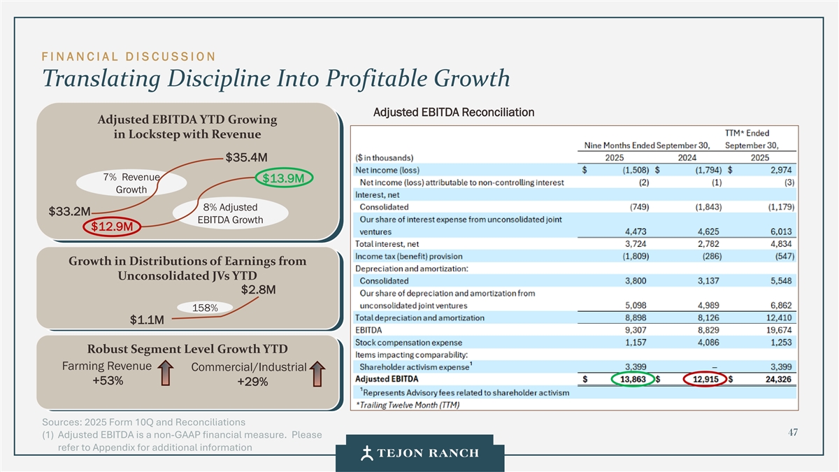 F I N ANCIAL D I S CUSSION Translating Discipline Into Profitable Growth Adjusted EBITDA Reconciliation Adjusted EBITDA YTD Growing in Lockstep with Revenue $35.4M 7% Revenue $13.9M Growth 8% Adjusted $33.2M EBITDA Growth $12.9M Growth in Distributions of Earnings from Unconsolidated JVs YTD $2.8M 158% $1.1M Robust Segment Level Growth YTD Farming Revenue Commercial/Industrial +53% +29% Sources: 2025 Form 10Q and Reconciliations 47 (1) Adjusted EBITDA is a non-GAAP financial measure. Please refer to Appendix for additional information