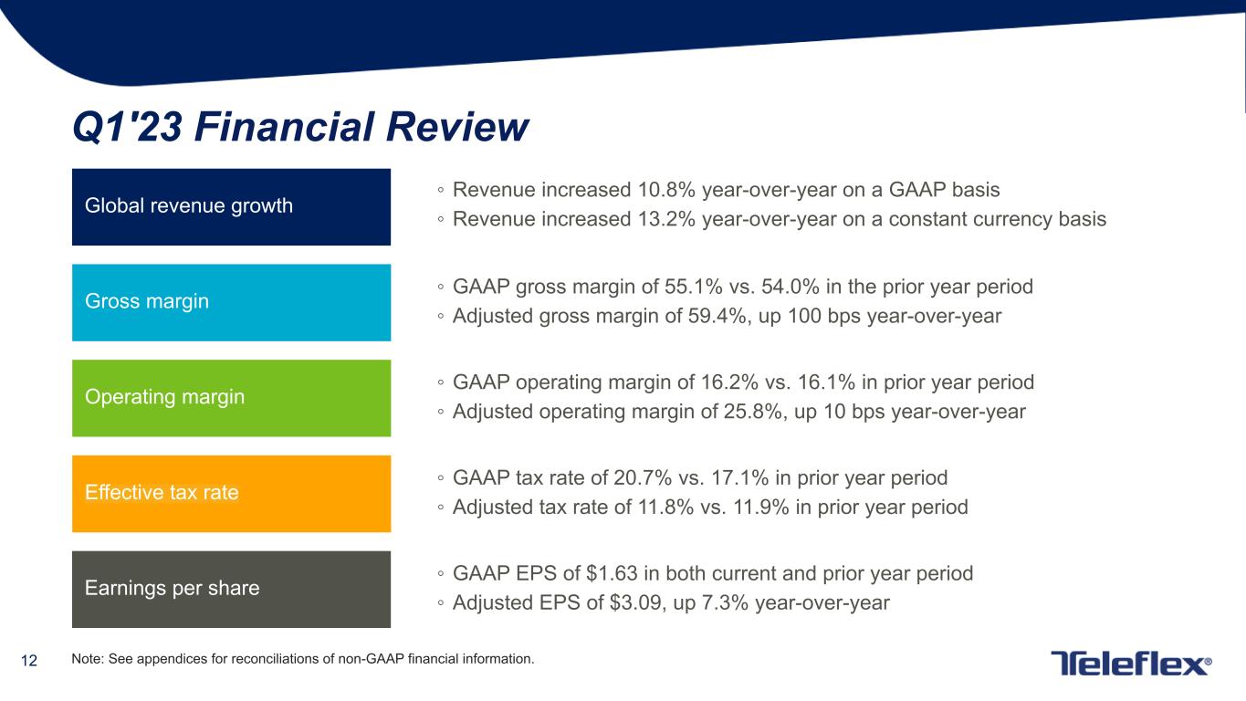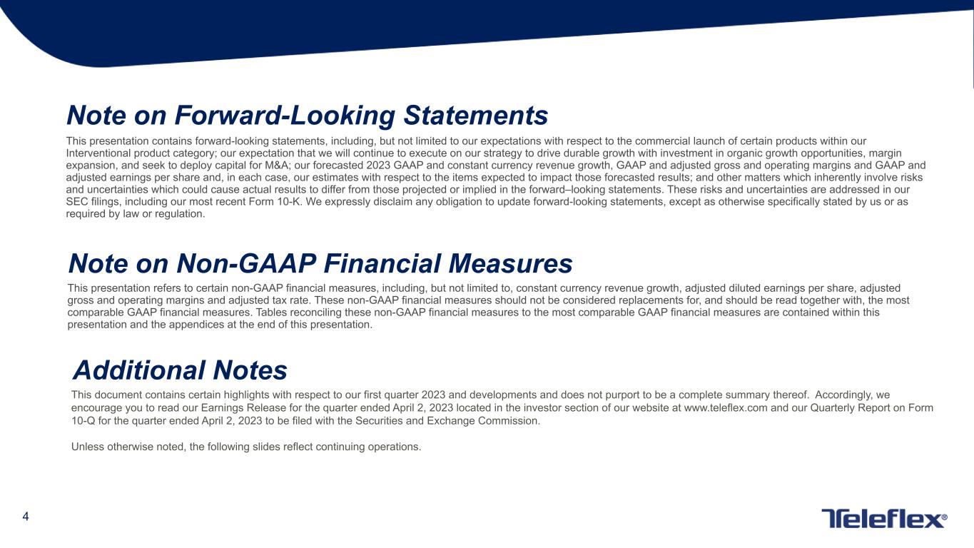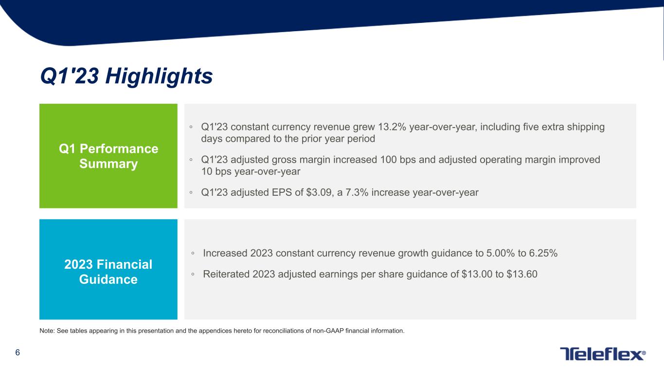 4 This presentation contains forward-looking statements, including, but not limited to our expectations with respect to the commercial launch of certain products within our Interventional product category; our expectation that we will continue to execute on our strategy to drive durable growth with investment in organic growth opportunities, margin expansion, and seek to deploy capital for M&A; our forecasted 2023 GAAP and constant currency revenue growth, GAAP and adjusted gross and operating margins and GAAP and adjusted earnings per share and, in each case, our estimates with respect to the items expected to impact those forecasted results; and other matters which inherently involve risks and uncertainties which could cause actual results to differ from those projected or implied in the forward–looking statements. These risks and uncertainties are addressed in our SEC filings, including our most recent Form 10-K. We expressly disclaim any obligation to update forward-looking statements, except as otherwise specifically stated by us or as required by law or regulation. Note on Forward-Looking Statements Note on Non-GAAP Financial Measures Additional Notes This document contains certain highlights with respect to our first quarter 2023 and developments and does not purport to be a complete summary thereof. Accordingly, we encourage you to read our Earnings Release for the quarter ended April 2, 2023 located in the investor section of our website at www.teleflex.com and our Quarterly Report on Form 10-Q for the quarter ended April 2, 2023 to be filed with the Securities and Exchange Commission. Unless otherwise noted, the following slides reflect continuing operations. This presentation refers to certain non-GAAP financial measures, including, but not limited to, constant currency revenue growth, adjusted diluted earnings per share, adjusted gross and operating margins and adjusted tax rate. These non-GAAP financial measures should not be considered replacements for, and should be read together with, the most comparable GAAP financial measures. Tables reconciling these non-GAAP financial measures to the most comparable GAAP financial measures are contained within this presentation and the appendices at the end of this presentation.