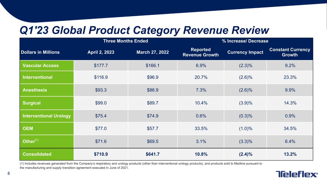 7 Q1'23 Segment Revenue Review Three Months Ended % Increase/ Decrease Dollars in Millions April 2, 2023 March 27, 2022 Reported Revenue Growth Currency Impact Constant Currency Growth Americas $411.9 $378.0 9.0% (0.2)% 9.2% EMEA $143.3 $136.9 4.7% (5.8)% 10.5% Asia $78.7 $69.2 13.8% (9.0)% 22.8% OEM $77.0 $57.6 33.5% (1.0)% 34.5% Consolidated $710.9 $641.7 10.8% (2.4)% 13.2%