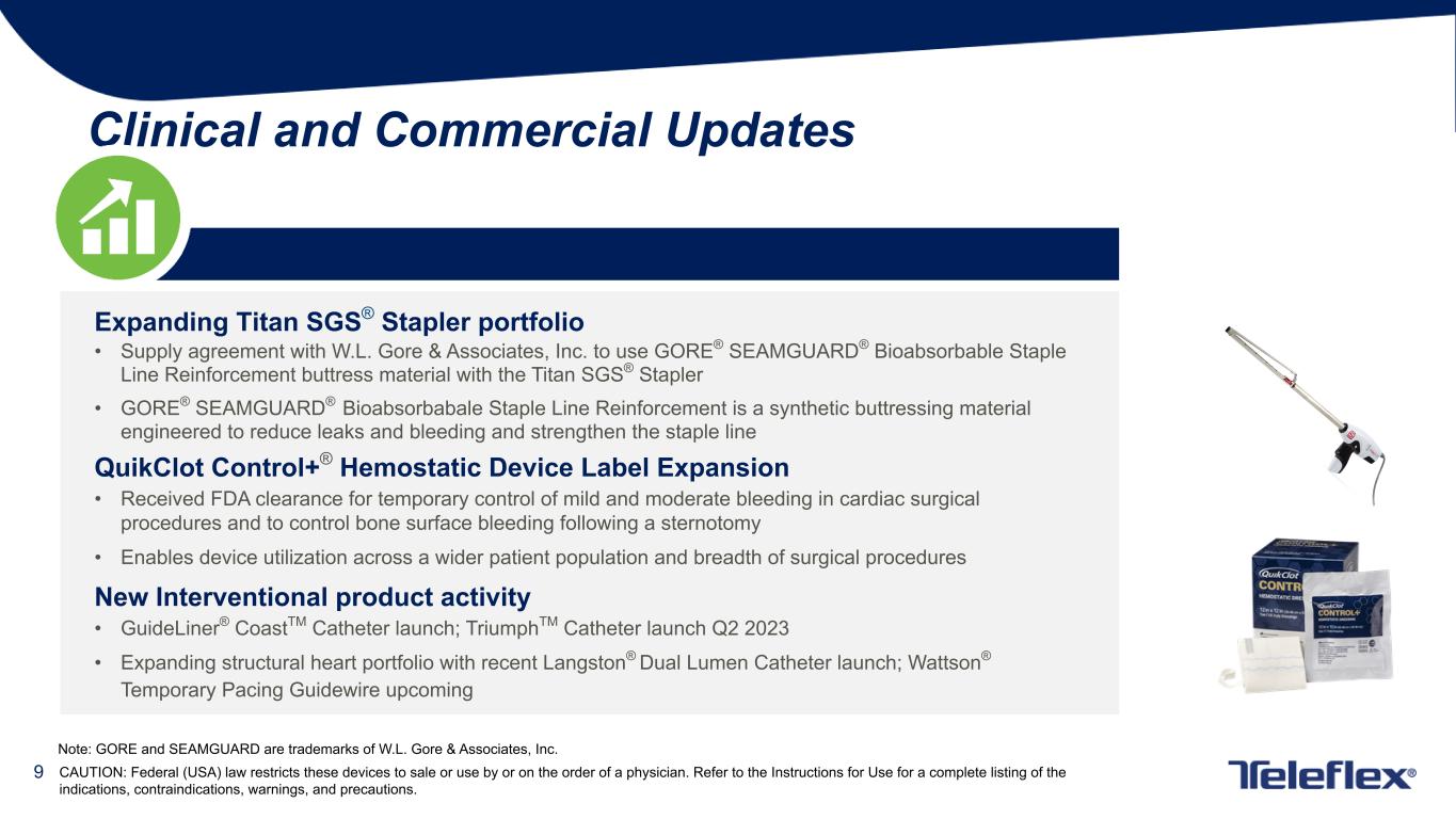 8 Q1'23 Global Product Category Revenue Review Three Months Ended % Increase/ Decrease Dollars in Millions April 2, 2023 March 27, 2022 Reported Revenue Growth Currency Impact Constant Currency Growth Vascular Access $177.7 $166.1 6.9% (2.3)% 9.2% Interventional $116.9 $96.9 20.7% (2.6)% 23.3% Anesthesia $93.3 $86.9 7.3% (2.6)% 9.9% Surgical $99.0 $89.7 10.4% (3.9)% 14.3% Interventional Urology $75.4 $74.9 0.6% (0.3)% 0.9% OEM $77.0 $57.7 33.5% (1.0)% 34.5% Other(1) $71.6 $69.5 3.1% (3.3)% 6.4% Consolidated $710.9 $641.7 10.8% (2.4)% 13.2% ◦ 1. Includes revenues generated from sales of the Company’s respiratory and urology products (other than interventional urology products). (1) Includes revenues generated from the Company’s respiratory and urology products (other than interventional urology products), and products sold to Medline pursuant to the manufacturing and supply transition agreement executed in June of 2021.
