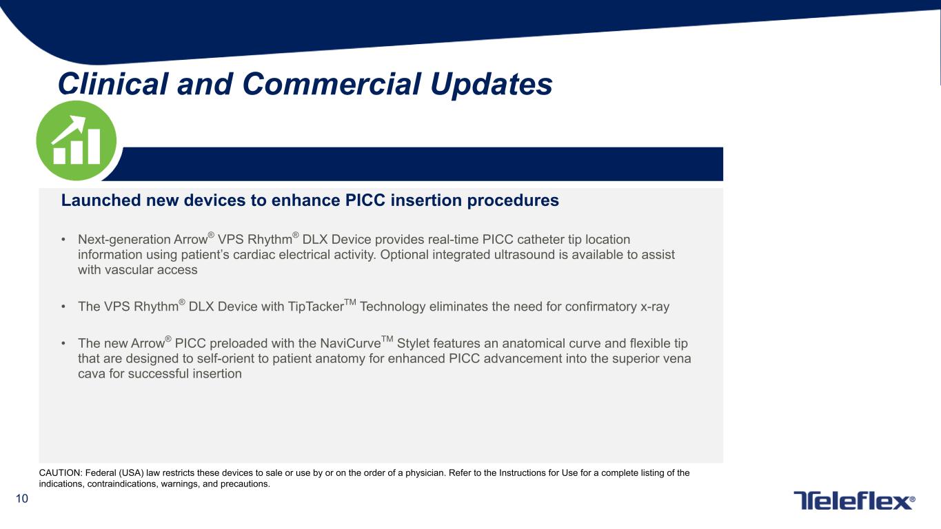 9 Clinical and Commercial Updates Expanding Titan SGS® Stapler portfolio • Supply agreement with W.L. Gore & Associates, Inc. to use GORE® SEAMGUARD® Bioabsorbable Staple Line Reinforcement buttress material with the Titan SGS® Stapler • GORE® SEAMGUARD® Bioabsorbabale Staple Line Reinforcement is a synthetic buttressing material engineered to reduce leaks and bleeding and strengthen the staple line QuikClot Control+® Hemostatic Device Label Expansion • Received FDA clearance for temporary control of mild and moderate bleeding in cardiac surgical procedures and to control bone surface bleeding following a sternotomy • Enables device utilization across a wider patient population and breadth of surgical procedures New Interventional product activity • GuideLiner® CoastTM Catheter launch; TriumphTM Catheter launch Q2 2023 • Expanding structural heart portfolio with recent Langston® Dual Lumen Catheter launch; Wattson® Temporary Pacing Guidewire upcoming Note: GORE and SEAMGUARD are trademarks of W.L. Gore & Associates, Inc. CAUTION: Federal (USA) law restricts these devices to sale or use by or on the order of a physician. Refer to the Instructions for Use for a complete listing of the indications, contraindications, warnings, and precautions.