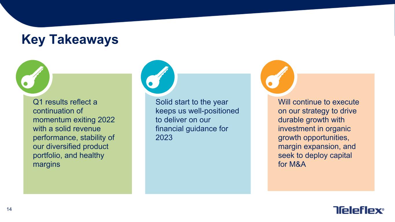 13 2023 Financial Guidance Summary 2023 Guidance Low High GAAP Revenue Growth 4.65% 5.90% Impact of Foreign Exchange Rate Fluctuations (0.35)% (0.35)% Constant Currency Revenue Growth (1) 5.00% 6.25% Adjusted Gross Margin 59.00% 59.50% Adjusted Operating Margin 26.00% 26.75% Adjusted EPS $13.00 $13.60 Adjusted EPS % Growth (0.5)% 4.1% Note: See appendices for reconciliations of non-GAAP information (1) Constant currency revenue growth includes a 0.2% headwind for the expected decrease in MSTA revenue associated with our prior divestiture of respiratory assets. Note: See appendices for reconciliations of non-GAAP financial information.