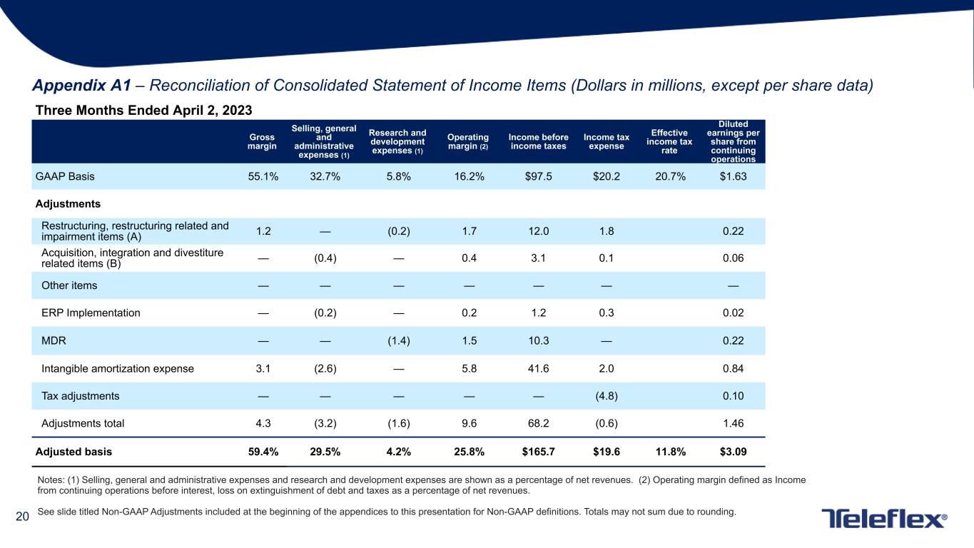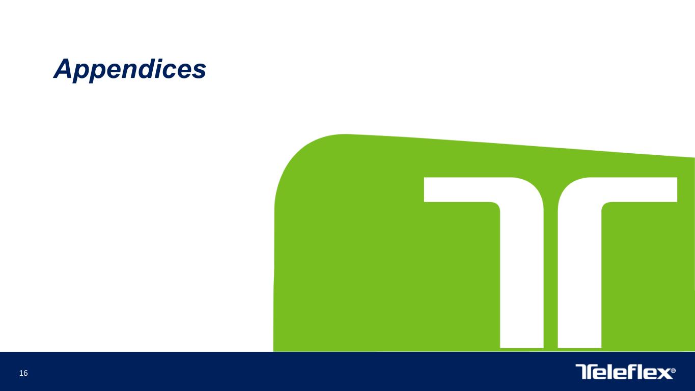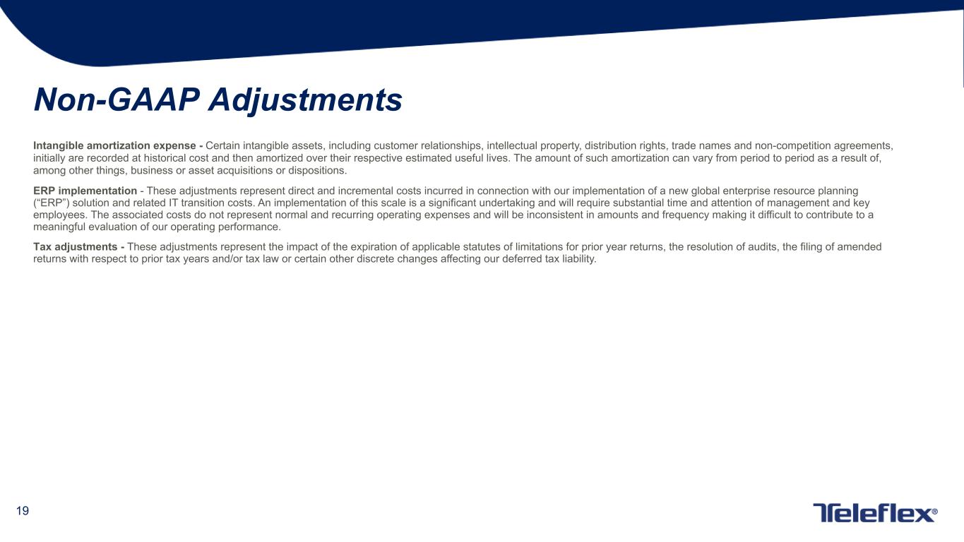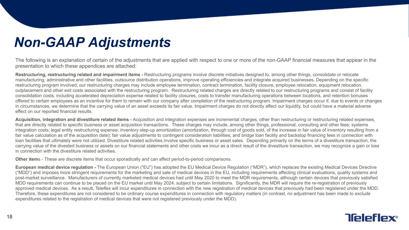 18 Non-GAAP Adjustments The following is an explanation of certain of the adjustments that are applied with respect to one or more of the non-GAAP financial measures that appear in the presentation to which these appendices are attached: Restructuring, restructuring related and impairment items - Restructuring programs involve discrete initiatives designed to, among other things, consolidate or relocate manufacturing, administrative and other facilities, outsource distribution operations, improve operating efficiencies and integrate acquired businesses. Depending on the specific restructuring program involved, our restructuring charges may include employee termination, contract termination, facility closure, employee relocation, equipment relocation, outplacement and other exit costs associated with the restructuring program. Restructuring related charges are directly related to our restructuring programs and consist of facility consolidation costs, including accelerated depreciation expense related to facility closures, costs to transfer manufacturing operations between locations, and retention bonuses offered to certain employees as an incentive for them to remain with our company after completion of the restructuring program. Impairment charges occur if, due to events or changes in circumstances, we determine that the carrying value of an asset exceeds its fair value. Impairment charges do not directly affect our liquidity, but could have a material adverse effect on our reported financial results. Acquisition, integration and divestiture related items - Acquisition and integration expenses are incremental charges, other than restructuring or restructuring related expenses, that are directly related to specific business or asset acquisition transactions. These charges may include, among other things, professional, consulting and other fees; systems integration costs; legal entity restructuring expense; inventory step-up amortization (amortization, through cost of goods sold, of the increase in fair value of inventory resulting from a fair value calculation as of the acquisition date); fair value adjustments to contingent consideration liabilities; and bridge loan facility and backstop financing fees in connection with loan facilities that ultimately were not utilized. Divestiture related activities involve specific business or asset sales. Depending primarily on the terms of a divestiture transaction, the carrying value of the divested business or assets on our financial statements and other costs we incur as a direct result of the divestiture transaction, we may recognize a gain or loss in connection with the divestiture related activities. Other items - These are discrete items that occur sporadically and can affect period-to-period comparisons. European medical device regulation - The European Union (“EU”) has adopted the EU Medical Device Regulation (“MDR”), which replaces the existing Medical Devices Directive (“MDD”) and imposes more stringent requirements for the marketing and sale of medical devices in the EU, including requirements affecting clinical evaluations, quality systems and post-market surveillance. Manufacturers of currently marketed medical devices had until May 2020 to meet the MDR requirements, although certain devices that previously satisfied MDD requirements can continue to be placed on the EU market until May 2024, subject to certain limitations. Significantly, the MDR will require the re-registration of previously approved medical devices. As a result, Teleflex will incur expenditures in connection with the new registration of medical devices that previously had been registered under the MDD. Therefore, these expenditures are not considered to be ordinary course expenditures in connection with regulatory matters (in contrast, no adjustment has been made to exclude expenditures related to the registration of medical devices that were not registered previously under the MDD).