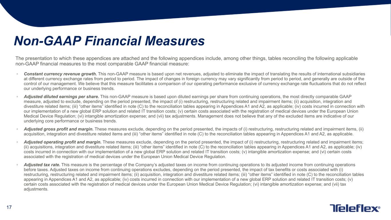 17 Non-GAAP Financial Measures The presentation to which these appendices are attached and the following appendices include, among other things, tables reconciling the following applicable non-GAAP financial measures to the most comparable GAAP financial measure: ◦ Constant currency revenue growth. This non-GAAP measure is based upon net revenues, adjusted to eliminate the impact of translating the results of international subsidiaries at different currency exchange rates from period to period. The impact of changes in foreign currency may vary significantly from period to period, and generally are outside of the control of our management. We believe that this measure facilitates a comparison of our operating performance exclusive of currency exchange rate fluctuations that do not reflect our underlying performance or business trends. ◦ Adjusted diluted earnings per share. This non-GAAP measure is based upon diluted earnings per share from continuing operations, the most directly comparable GAAP measure, adjusted to exclude, depending on the period presented, the impact of (i) restructuring, restructuring related and impairment items; (ii) acquisition, integration and divestiture related items; (iii) “other items” identified in note (C) to the reconciliation tables appearing in Appendices A1 and A2, as applicable; (iv) costs incurred in connection with our implementation of a new global ERP solution and related IT transition costs; (v) certain costs associated with the registration of medical devices under the European Union Medical Device Regulation; (vi) intangible amortization expense; and (vii) tax adjustments. Management does not believe that any of the excluded items are indicative of our underlying core performance or business trends. ◦ Adjusted gross profit and margin. These measures exclude, depending on the period presented, the impacts of (i) restructuring, restructuring related and impairment items, (ii) acquisition, integration and divestiture related items and (iii) “other items” identified in note (C) to the reconciliation tables appearing in Appendices A1 and A2, as applicable. ◦ Adjusted operating profit and margin. These measures exclude, depending on the period presented, the impact of (i) restructuring, restructuring related and impairment items; (ii) acquisitions, integration and divestiture related items; (iii) “other items” identified in note (C) to the reconciliation tables appearing in Appendices A1 and A2, as applicable; (iv) costs incurred in connection with our implementation of a new global ERP solution and related IT transition costs; (v) intangible amortization expense; and (vi) certain costs associated with the registration of medical devices under the European Union Medical Device Regulation. ◦ Adjusted tax rate. This measure is the percentage of the Company’s adjusted taxes on income from continuing operations to its adjusted income from continuing operations before taxes. Adjusted taxes on income from continuing operations excludes, depending on the period presented, the impact of tax benefits or costs associated with (i) restructuring, restructuring related and impairment items; (ii) acquisition, integration and divestiture related items; (iii) “other items” identified in note (C) to the reconciliation tables appearing in Appendices A1 and A2, as applicable; (iv) costs incurred in connection with our implementation of a new global ERP solution and related IT transition costs; (v) certain costs associated with the registration of medical devices under the European Union Medical Device Regulation; (vi) intangible amortization expense; and (vii) tax adjustments.