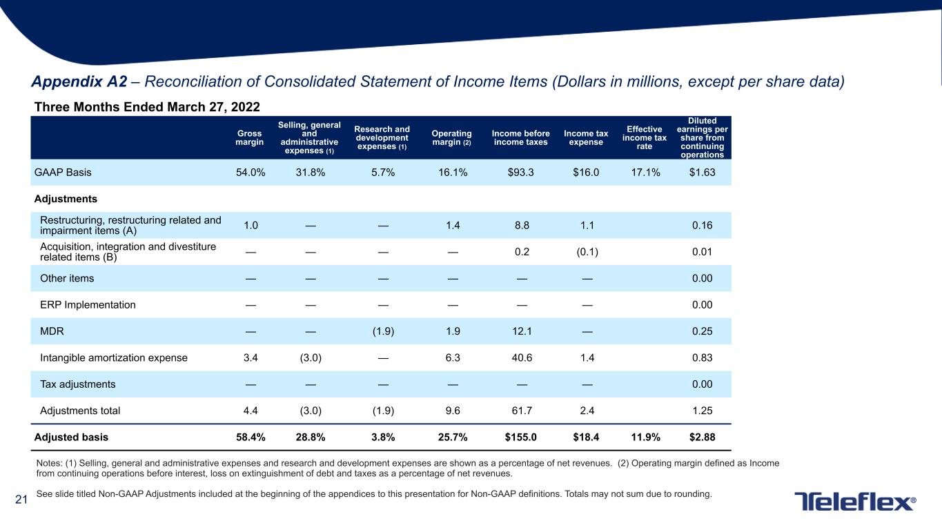 20 Notes: (1) Selling, general and administrative expenses and research and development expenses are shown as a percentage of net revenues. (2) Operating margin defined as Income from continuing operations before interest, loss on extinguishment of debt and taxes as a percentage of net revenues. See slide titled Non-GAAP Adjustments included at the beginning of the appendices to this presentation for Non-GAAP definitions. Totals may not sum due to rounding. Appendix A1 – Reconciliation of Consolidated Statement of Income Items (Dollars in millions, except per share data) Three Months Ended April 2, 2023 Gross margin Selling, general and administrative expenses (1) Research and development expenses (1) Operating margin (2) Income before income taxes Income tax expense Effective income tax rate Diluted earnings per share from continuing operations GAAP Basis 55.1% 32.7% 5.8% 16.2% $97.5 $20.2 20.7% $1.63 Adjustments Restructuring, restructuring related and impairment items (A) 1.2 — (0.2) 1.7 12.0 1.8 0.22 Acquisition, integration and divestiture related items (B) — (0.4) — 0.4 3.1 0.1 0.06 Other items — — — — — — — ERP Implementation — (0.2) — 0.2 1.2 0.3 0.02 MDR — — (1.4) 1.5 10.3 — 0.22 Intangible amortization expense 3.1 (2.6) — 5.8 41.6 2.0 0.84 Tax adjustments — — — — — (4.8) 0.10 Adjustments total 4.3 (3.2) (1.6) 9.6 68.2 (0.6) 1.46 Adjusted basis 59.4% 29.5% 4.2% 25.8% $165.7 $19.6 11.8% $3.09