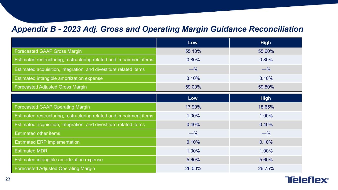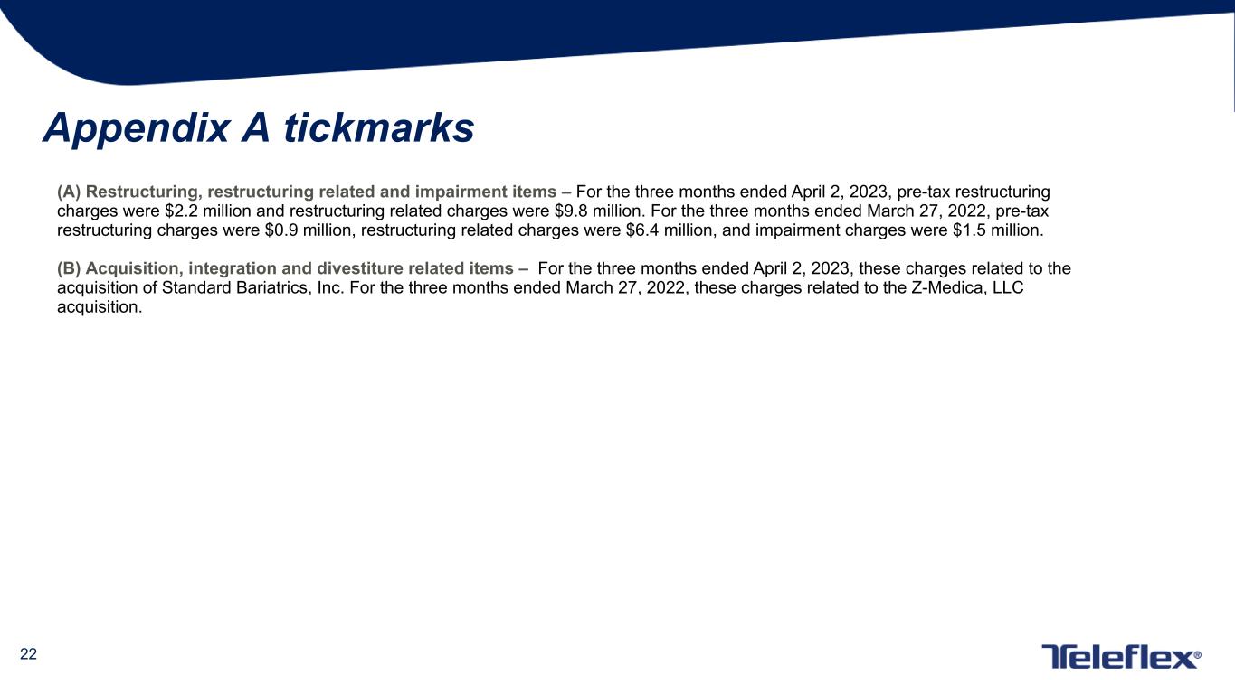 22 Appendix A tickmarks (A) Restructuring, restructuring related and impairment items – For the three months ended April 2, 2023, pre-tax restructuring charges were $2.2 million and restructuring related charges were $9.8 million. For the three months ended March 27, 2022, pre-tax restructuring charges were $0.9 million, restructuring related charges were $6.4 million, and impairment charges were $1.5 million. (B) Acquisition, integration and divestiture related items – For the three months ended April 2, 2023, these charges related to the acquisition of Standard Bariatrics, Inc. For the three months ended March 27, 2022, these charges related to the Z-Medica, LLC acquisition.