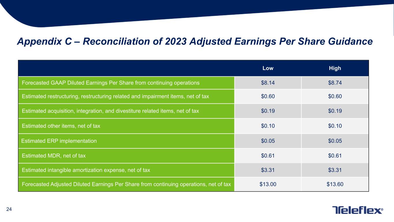 23 Appendix B - 2023 Adj. Gross and Operating Margin Guidance Reconciliation Low High Forecasted GAAP Gross Margin 55.10% 55.60% Estimated restructuring, restructuring related and impairment items 0.80% 0.80% Estimated acquisition, integration, and divestiture related items —% —% Estimated intangible amortization expense 3.10% 3.10% Forecasted Adjusted Gross Margin 59.00% 59.50% Low High Forecasted GAAP Operating Margin 17.90% 18.65% Estimated restructuring, restructuring related and impairment items 1.00% 1.00% Estimated acquisition, integration, and divestiture related items 0.40% 0.40% Estimated other items —% —% Estimated ERP implementation 0.10% 0.10% Estimated MDR 1.00% 1.00% Estimated intangible amortization expense 5.60% 5.60% Forecasted Adjusted Operating Margin 26.00% 26.75%