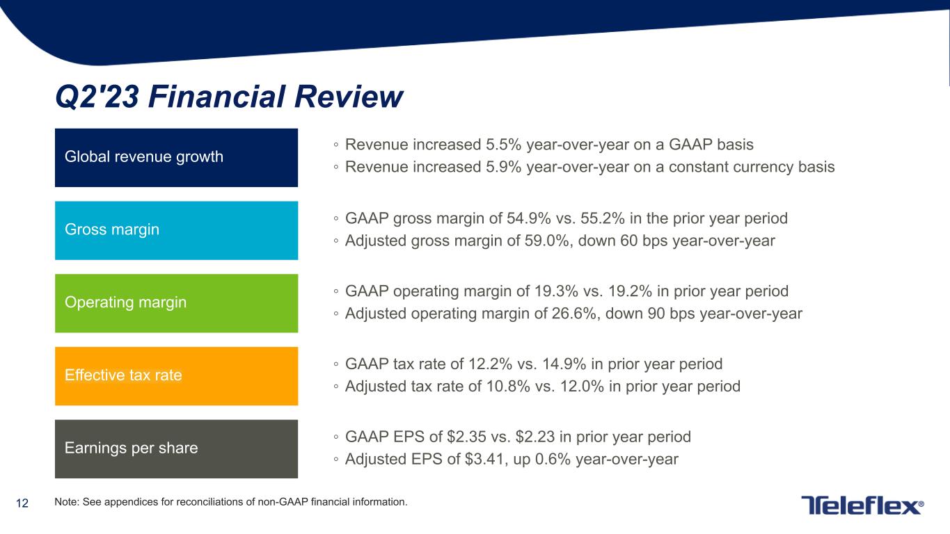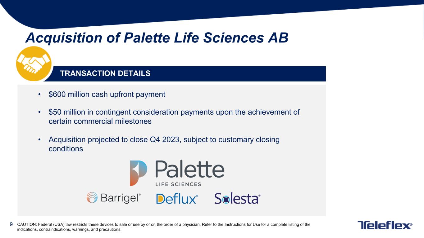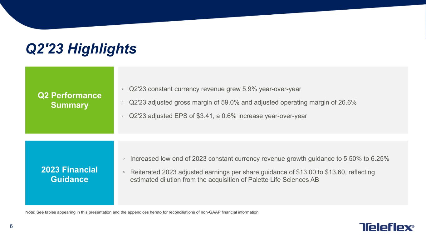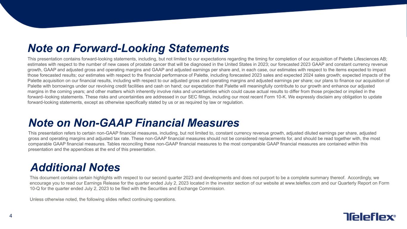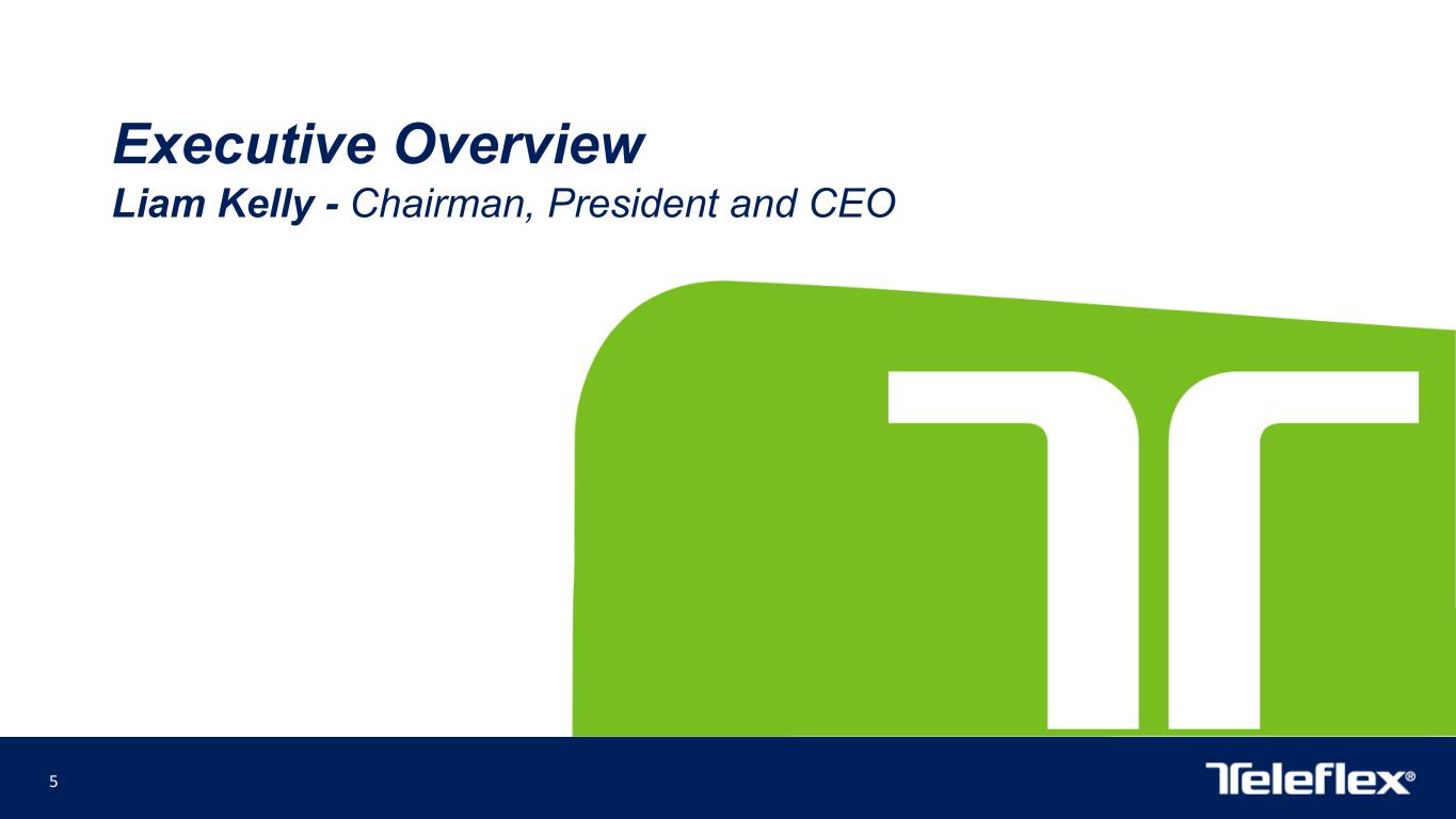 4 This presentation contains forward-looking statements, including, but not limited to our expectations regarding the timing for completion of our acquisition of Palette Lifesciences AB; estimates with respect to the number of new cases of prostate cancer that will be diagnosed in the United States in 2023; our forecasted 2023 GAAP and constant currency revenue growth, GAAP and adjusted gross and operating margins and GAAP and adjusted earnings per share and, in each case, our estimates with respect to the items expected to impact those forecasted results; our estimates with respect to the financial performance of Palette, including forecasted 2023 sales and expected 2024 sales growth; expected impacts of the Palette acquisition on our financial results, including with respect to our adjusted gross and operating margins and adjusted earnings per share; our plans to finance our acquisition of Palette with borrowings under our revolving credit facilities and cash on hand; our expectation that Palette will meaningfully contribute to our growth and enhance our adjusted margins in the coming years; and other matters which inherently involve risks and uncertainties which could cause actual results to differ from those projected or implied in the forward–looking statements. These risks and uncertainties are addressed in our SEC filings, including our most recent Form 10-K. We expressly disclaim any obligation to update forward-looking statements, except as otherwise specifically stated by us or as required by law or regulation. Note on Forward-Looking Statements Note on Non-GAAP Financial Measures Additional Notes This document contains certain highlights with respect to our second quarter 2023 and developments and does not purport to be a complete summary thereof. Accordingly, we encourage you to read our Earnings Release for the quarter ended July 2, 2023 located in the investor section of our website at www.teleflex.com and our Quarterly Report on Form 10-Q for the quarter ended July 2, 2023 to be filed with the Securities and Exchange Commission. Unless otherwise noted, the following slides reflect continuing operations. This presentation refers to certain non-GAAP financial measures, including, but not limited to, constant currency revenue growth, adjusted diluted earnings per share, adjusted gross and operating margins and adjusted tax rate. These non-GAAP financial measures should not be considered replacements for, and should be read together with, the most comparable GAAP financial measures. Tables reconciling these non-GAAP financial measures to the most comparable GAAP financial measures are contained within this presentation and the appendices at the end of this presentation.
