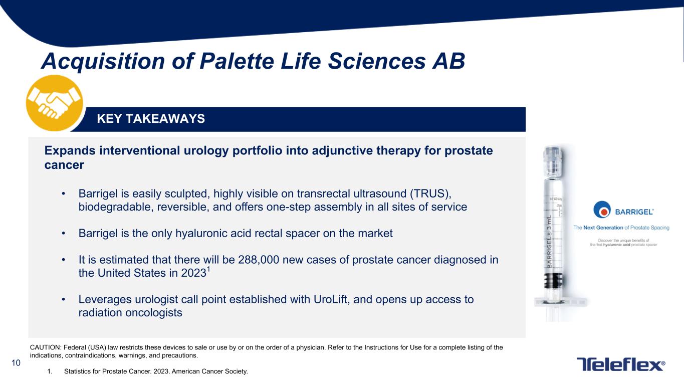 9 Acquisition of Palette Life Sciences AB • $600 million cash upfront payment • $50 million in contingent consideration payments upon the achievement of certain commercial milestones • Acquisition projected to close Q4 2023, subject to customary closing conditions CAUTION: Federal (USA) law restricts these devices to sale or use by or on the order of a physician. Refer to the Instructions for Use for a complete listing of the indications, contraindications, warnings, and precautions. TRANSACTION DETAILS