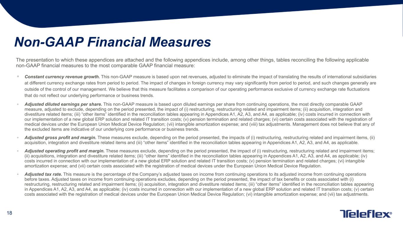 19 Non-GAAP Adjustments The following is an explanation of certain of the adjustments that are applied with respect to one or more of the non-GAAP financial measures that appear in the presentation to which these appendices are attached: Restructuring, restructuring related and impairment items - Restructuring programs involve discrete initiatives designed to, among other things, consolidate or relocate manufacturing, administrative and other facilities, outsource distribution operations, improve operating efficiencies and integrate acquired businesses. Depending on the specific restructuring program involved, our restructuring charges may include employee termination, contract termination, facility closure, employee relocation, equipment relocation, outplacement and other exit costs associated with the restructuring program. Restructuring related charges are directly related to our restructuring programs and consist of facility consolidation costs, including accelerated depreciation expense related to facility closures, costs to transfer manufacturing operations between locations, and retention bonuses offered to certain employees as an incentive for them to remain with our company after completion of the restructuring program. Impairment charges occur if, due to events or changes in circumstances, we determine that the carrying value of an asset exceeds its fair value. Impairment charges do not directly affect our liquidity, but could have a material adverse effect on our reported financial results. Acquisition, integration and divestiture related items - Acquisition and integration expenses are incremental charges, other than restructuring or restructuring related expenses, that are directly related to specific business or asset acquisition transactions. These charges may include, among other things, professional, consulting and other fees; systems integration costs; legal entity restructuring expense; inventory step-up amortization (amortization, through cost of goods sold, of the increase in fair value of inventory resulting from a fair value calculation as of the acquisition date); fair value adjustments to contingent consideration liabilities; and bridge loan facility and backstop financing fees in connection with loan facilities that ultimately were not utilized. Divestiture related activities involve specific business or asset sales. Depending primarily on the terms of a divestiture transaction, the carrying value of the divested business or assets on our financial statements and other costs we incur as a direct result of the divestiture transaction, we may recognize a gain or loss in connection with the divestiture related activities. Other items - These are discrete items that occur sporadically and can affect period-to-period comparisons. Pension termination and related charges - These adjustments represent charges associated with the planned termination of the Teleflex Incorporated Retirement Income Plan, a frozen U.S. defined benefit pension plan, and related direct incremental costs. These charges and costs do not represent normal and recurring operating expenses, will be inconsistent in amounts and frequency, and are not expected to recur once the plan termination process has been completed. Accordingly, management has excluded these amounts to facilitate an evaluation of our current operating performance and a comparison to our past operating performance.