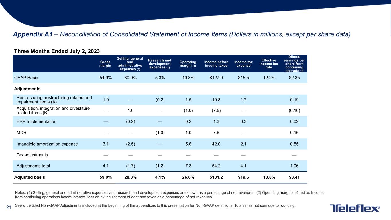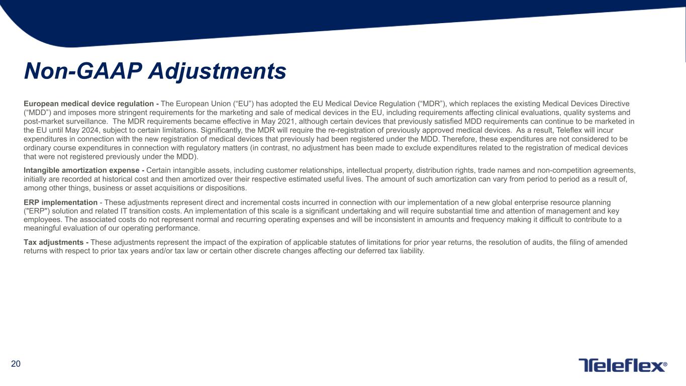 20 Non-GAAP Adjustments European medical device regulation - The European Union (“EU”) has adopted the EU Medical Device Regulation (“MDR”), which replaces the existing Medical Devices Directive (“MDD”) and imposes more stringent requirements for the marketing and sale of medical devices in the EU, including requirements affecting clinical evaluations, quality systems and post-market surveillance. The MDR requirements became effective in May 2021, although certain devices that previously satisfied MDD requirements can continue to be marketed in the EU until May 2024, subject to certain limitations. Significantly, the MDR will require the re-registration of previously approved medical devices. As a result, Teleflex will incur expenditures in connection with the new registration of medical devices that previously had been registered under the MDD. Therefore, these expenditures are not considered to be ordinary course expenditures in connection with regulatory matters (in contrast, no adjustment has been made to exclude expenditures related to the registration of medical devices that were not registered previously under the MDD). Intangible amortization expense - Certain intangible assets, including customer relationships, intellectual property, distribution rights, trade names and non-competition agreements, initially are recorded at historical cost and then amortized over their respective estimated useful lives. The amount of such amortization can vary from period to period as a result of, among other things, business or asset acquisitions or dispositions. ERP implementation - These adjustments represent direct and incremental costs incurred in connection with our implementation of a new global enterprise resource planning ("ERP") solution and related IT transition costs. An implementation of this scale is a significant undertaking and will require substantial time and attention of management and key employees. The associated costs do not represent normal and recurring operating expenses and will be inconsistent in amounts and frequency making it difficult to contribute to a meaningful evaluation of our operating performance. Tax adjustments - These adjustments represent the impact of the expiration of applicable statutes of limitations for prior year returns, the resolution of audits, the filing of amended returns with respect to prior tax years and/or tax law or certain other discrete changes affecting our deferred tax liability.