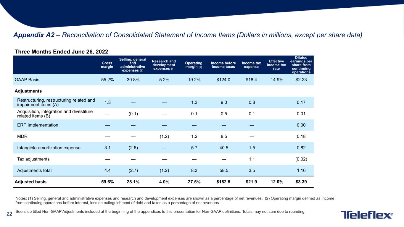 21 Notes: (1) Selling, general and administrative expenses and research and development expenses are shown as a percentage of net revenues. (2) Operating margin defined as Income from continuing operations before interest, loss on extinguishment of debt and taxes as a percentage of net revenues. See slide titled Non-GAAP Adjustments included at the beginning of the appendices to this presentation for Non-GAAP definitions. Totals may not sum due to rounding. Appendix A1 – Reconciliation of Consolidated Statement of Income Items (Dollars in millions, except per share data) Three Months Ended July 2, 2023 Gross margin Selling, general and administrative expenses (1) Research and development expenses (1) Operating margin (2) Income before income taxes Income tax expense Effective income tax rate Diluted earnings per share from continuing operations GAAP Basis 54.9% 30.0% 5.3% 19.3% $127.0 $15.5 12.2% $2.35 Adjustments Restructuring, restructuring related and impairment items (A) 1.0 — (0.2) 1.5 10.8 1.7 0.19 Acquisition, integration and divestiture related items (B) — 1.0 — (1.0) (7.5) — (0.16) ERP Implementation — (0.2) — 0.2 1.3 0.3 0.02 MDR — — (1.0) 1.0 7.6 — 0.16 Intangible amortization expense 3.1 (2.5) — 5.6 42.0 2.1 0.85 Tax adjustments — — — — — — — Adjustments total 4.1 (1.7) (1.2) 7.3 54.2 4.1 1.06 Adjusted basis 59.0% 28.3% 4.1% 26.6% $181.2 $19.6 10.8% $3.41