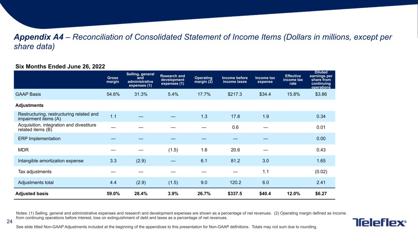 23 Appendix A3 – Reconciliation of Consolidated Statement of Income Items (Dollars in millions, except per share data) Six Months Ended July 2, 2023 Gross margin Selling, general and administrative expenses (1) Research and development expenses (1) Operating margin (2) Income before income taxes Income tax expense Effective income tax rate Diluted earnings per share from continuing operations GAAP Basis 55.0% 31.4% 5.6% 17.8% $224.4 $35.7 15.9% $3.99 Adjustments Restructuring, restructuring related and impairment items (A) 1.1 — (0.2) 1.6 22.8 3.5 0.41 Acquisition, integration and divestiture related items (B) — 0.3 — (0.3) (4.4) 0.1 (0.10) ERP Implementation — (0.2) — 0.2 2.5 0.6 0.04 MDR — — (1.2) 1.2 17.9 — 0.38 Intangible amortization expense 3.1 (2.6) — 5.7 83.6 4.1 1.68 Tax adjustments — — — — — (4.8) 0.10 Adjustments total 4.2 (2.5) (1.4) 8.4 122.4 3.5 2.51 Adjusted basis 59.2% 28.9% 4.2% 26.2% $346.8 $39.2 11.3% $6.50 Notes: (1) Selling, general and administrative expenses and research and development expenses are shown as a percentage of net revenues. (2) Operating margin defined as Income from continuing operations before interest, loss on extinguishment of debt and taxes as a percentage of net revenues. See slide titled Non-GAAP Adjustments included at the beginning of the appendices to this presentation for Non-GAAP definitions. Totals may not sum due to rounding.