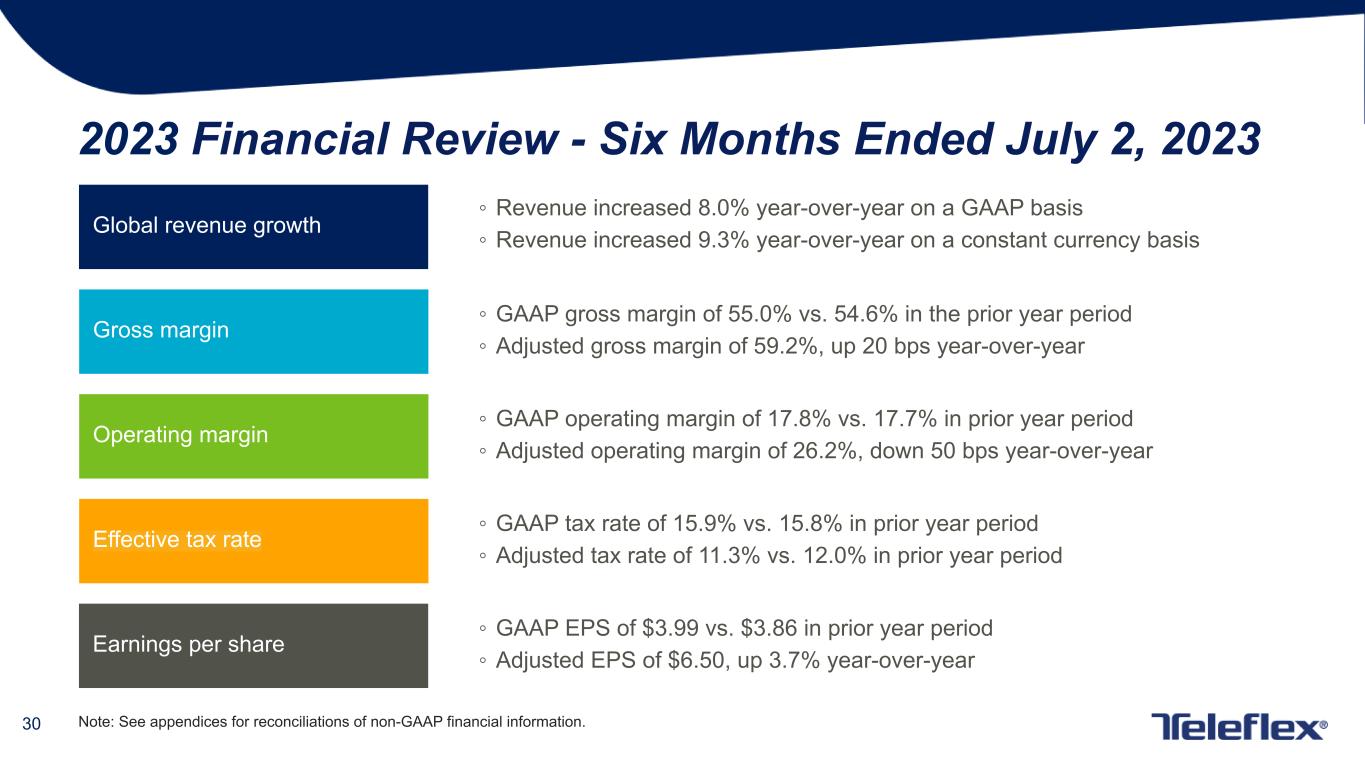 29 2023 Global Product Category Revenue Review Six Months Ended % Increase/ Decrease Dollars in Millions July 2, 2023 June 26, 2022 Reported Revenue Growth Currency Impact Constant Currency Growth Vascular Access $351.4 $330.1 6.5% (1.4)% 7.9% Interventional $241.7 $211.3 14.4% (1.5)% 15.9% Anesthesia $194.2 $191.6 1.3% (1.1)% 2.4% Surgical $205.0 $189.3 8.3% (2.5)% 10.8% Interventional Urology $153.2 $154.7 (1.0)% (0.3)% (0.7)% OEM $161.1 $127.7 26.2% (0.2)% 26.4% Other $147.6 $141.6 4.2% (1.4)% 5.6% Consolidated $1,454.2 $1,346.3 8.0% (1.3)% 9.3% ◦ 1. Includes revenues generated from sales of the Company’s respiratory and urology products (other than interventional urology products).